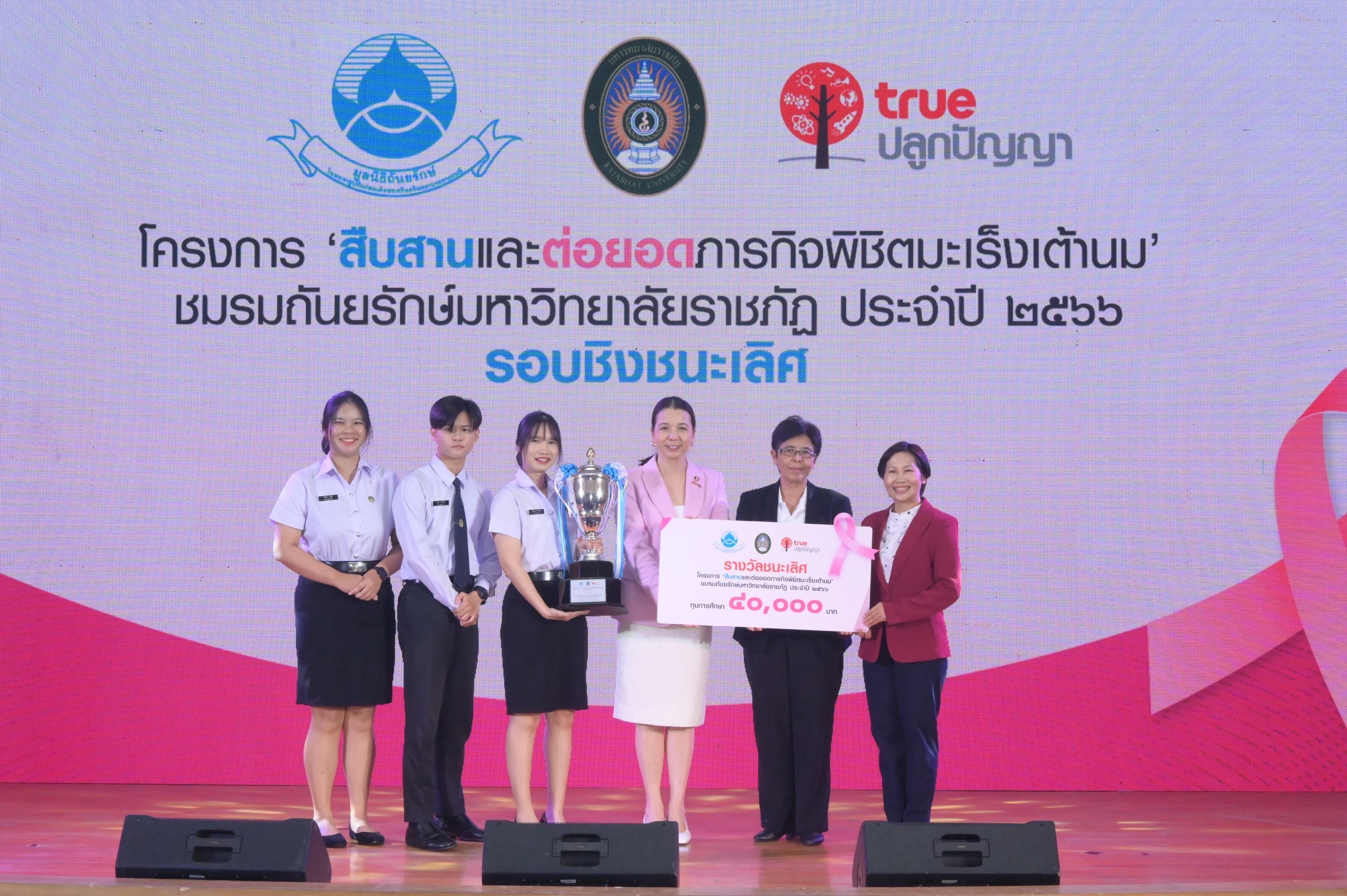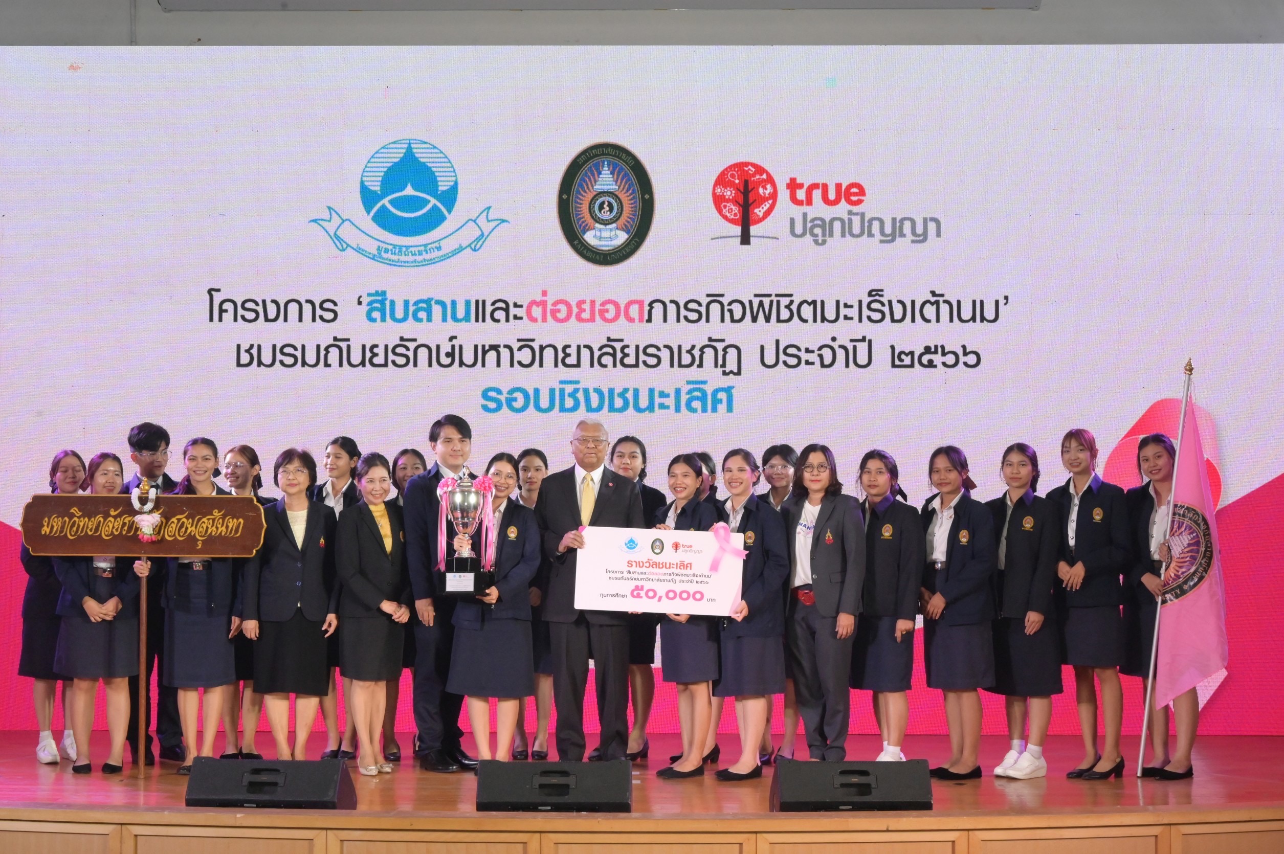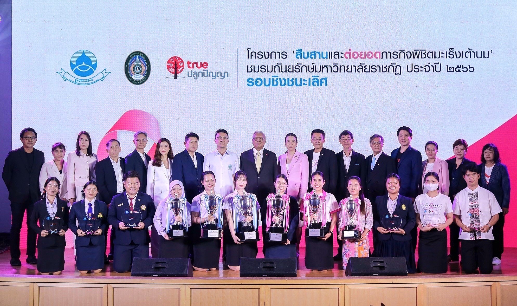 มูลนิธิถันยรักษ์ ในพระราชูปถัมภ์สมเด็จพระศรีนครินทราบรมราชชนนี โดย นายจิรายุ อิศรางกูร ณ อยุธยา รองประธานกรรมการมูลนิธิถันยรักษ์ฯ (ที่ 4 จากซ้าย) และนางบุษดี เจียรวนนท์ เลขาธิการมูลนิธิถันยรักษ์ฯ (ที่ 4 จากขวา) ร่วมกับ บมจ. ทรู คอร์ปอเรชั่น โดย นายประพาฬพงษ์ มากนวล หัวหน้าฝ่ายทรูปลูกปัญญา (ขวาสุด) และมหาวิทยาลัยราชภัฏทั่วประเทศ จัดประกวดโครงการ ‘สืบสานและต่อยอดภารกิจพิชิตมะเร็งเต้านม’ ชมรมถันยรักษ์ มหาวิทยาลัยราชภัฏ ประจําปี 2566 ภายใต้โครงการสืบสานพระราชปณิธานสมเด็จย่า ต้านภัยมะเร็งเต้านม เพื่อร่วมสร้างความตระหนักถึงภัยของมะเร็งเต้านม และรณรงค์ให้ผู้หญิงไทยรู้จักวิธีการตรวจเต้านมด้วยตนเองอย่างถูกต้อง พร้อมทั้งสังเกตการเปลี่ยนแปลงอย่างสม่ำเสมอ โดยมีความมุ่งหวังที่จะช่วยลดความเสี่ยงจากการเจ็บป่วย และลดอัตราการเสียชีวิตด้วยโรคมะเร็งเต้านม ผ่านกิจกรรมรณรงค์สื่อสารของนักศึกษาจากชมรมถันยรักษ์ ครอบคลุมการให้ความรู้สู่ชุมชนในพื้นที่บริการการศึกษาของมหาวิทยาลัยราชภัฏทั่วประเทศ ร่วมด้วย นายแพทย์เฉลิมเดช กรรณวัฒน์ แพทย์ประจำศูนย์ถันยรักษ์ และรองประธานโครงการสืบสานพระราชปณิธานสมเด็จย่า ต้านภัยมะเร็งเต้านม (ที่ 2 จากขวา) นายแพทย์เอกชัย เพียรศรีวัชรา รองอธิบดีกรมอนามัย กระทรวงสาธารณสุข (ที่ 3 จากซ้าย) นายแพทย์ชลพันธ์ ปิยถาวรอนันต์ ผู้อำนวยการกองอนามัยวัยทำงาน กรมอนามัย กระทรวงสาธารณสุข (ซ้ายสุด) นายแพทย์ชลทิศ อุไรฤกษ์กุล ที่ปรึกษาสำนักส่งเสริมสุขภาพ กรมอนามัย กระทรวงสาธารณสุข (ที่ 2 จากซ้าย) และนายบรรยงค์ สุวรรณผ่อง นักวิชาการนิเทศศาสตร์ (ที่ 3 จากขวา) ให้เกียรติร่วมงานและมอบรางวัลให้แก่ชมรมถันยรักษ์ จากมหาวิทยาลัยราชภัฏ ทั้ง 14 ชมรม เมื่อวันที่ 29 ก.พ. 2567 ที่ผ่านมา ซึ่งผลการประกวดรอบชิงชนะเลิศมีดังนี้