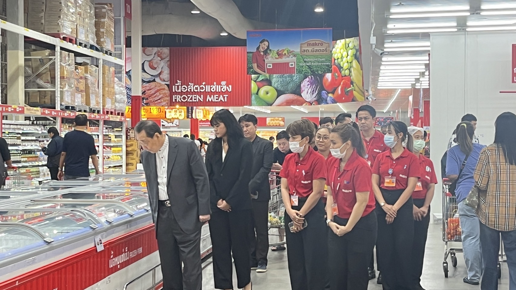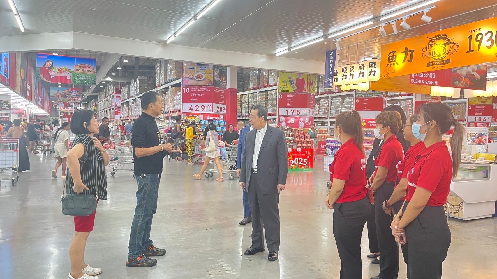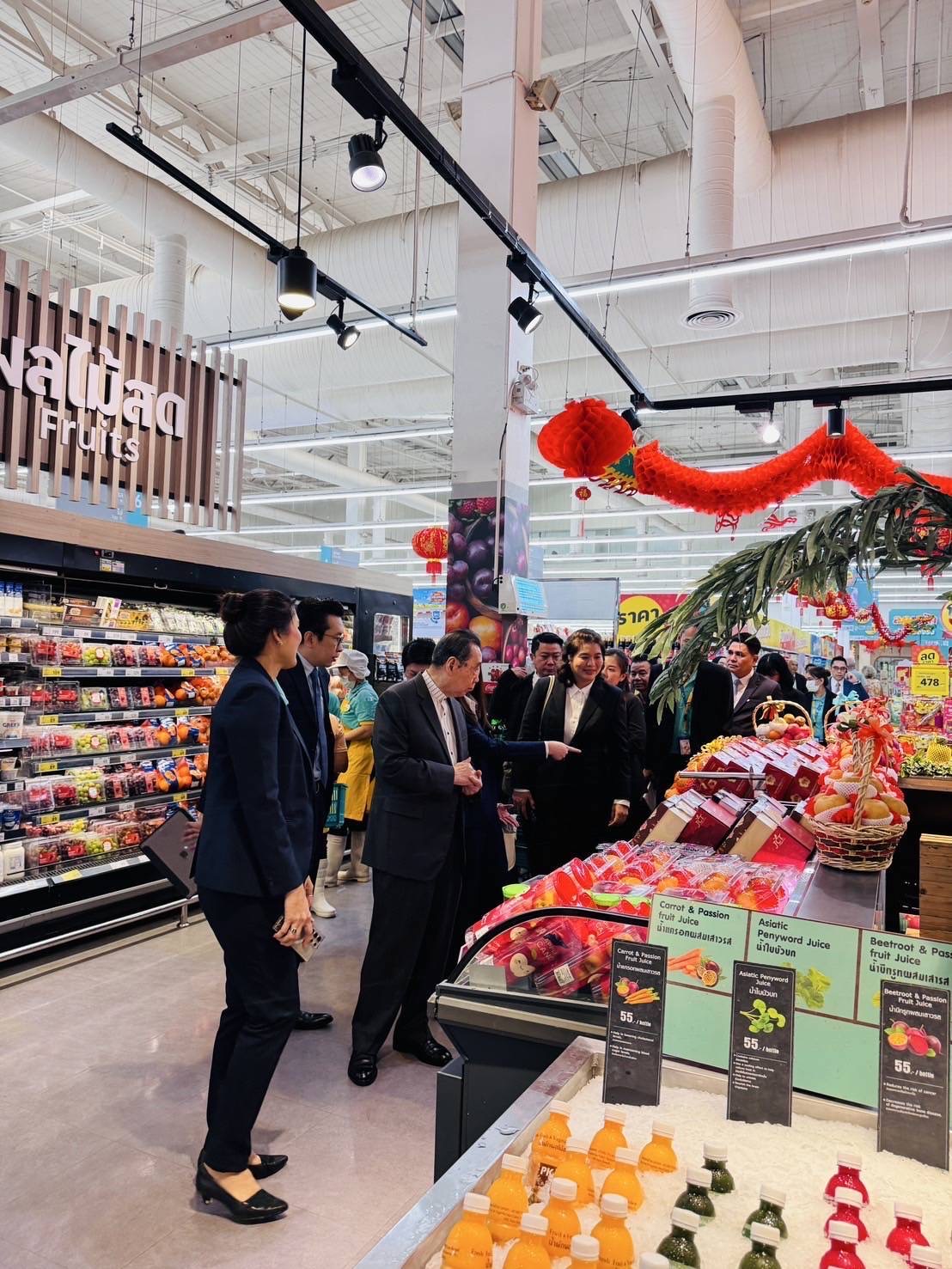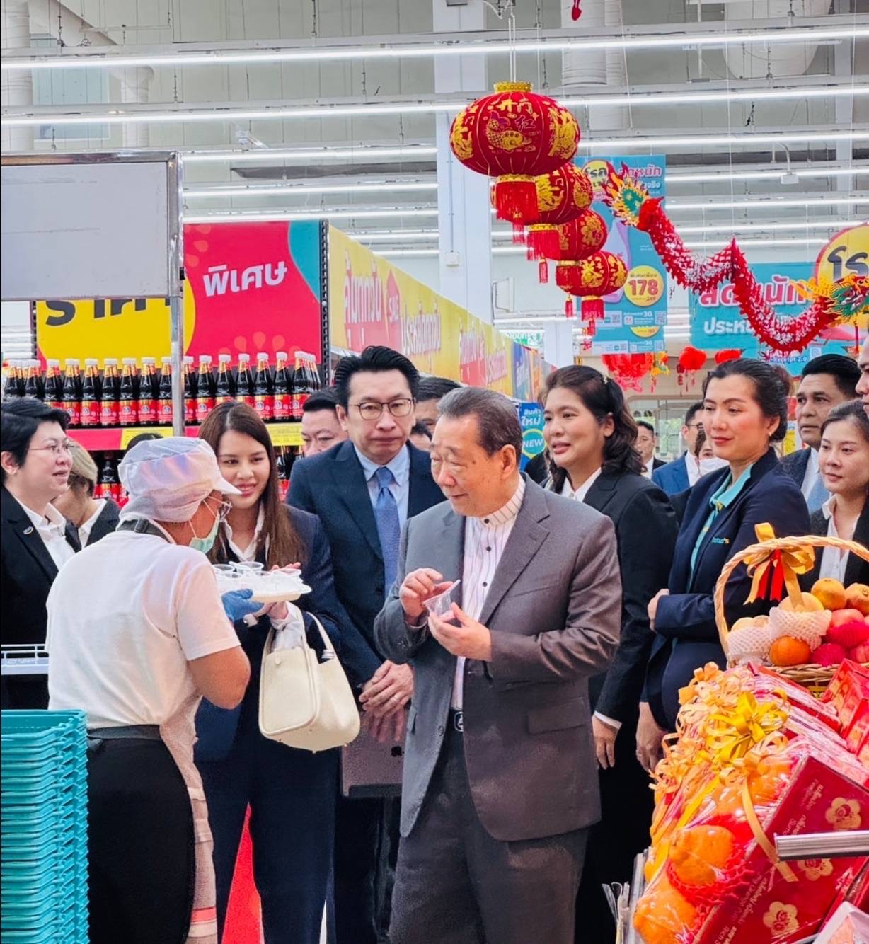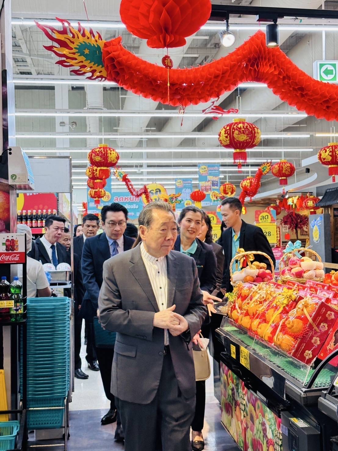 ท่านประธานอาวุโสได้เดินตรวจเยี่ยมพื้นที่ขาย ทั้งโซนผลไม้มงคล อาหารสดสำหรับจัดโต๊ะไหว้ และสินค้าพิเศษสำหรับตรุษจีน พร้อมทั้งพูดคุยให้กำลังใจกับพนักงานทุกระดับอย่างใกล้ชิด ท่านยังได้เน้นย้ำถึงบทบาทสำคัญของพนักงานในการสร้างความประทับใจให้ลูกค้า และสนับสนุนชุมชนในช่วงเทศกาลสำคัญ