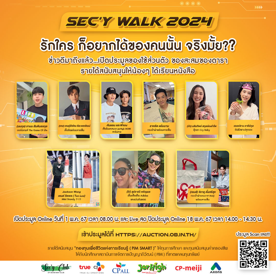 ชมรมเลขานุการเครือซีพี เสิร์ฟกิจกรรม สุดเอ็กซ์คลูซีฟ ให้เพื่อน ๆ ชาวซีพี และเหล่าแฟน ๆ ได้อิ่มอกอิ่มใจ ร่วมบุญกับ ศิลปินดาราคนโปรด กับกิจกรรมประมูลของรักจากดารา ทางเว็บไซต์ https://auction.ob.in.th ได้ตั้งแต่ วันที่ 1 พ.ค. 2567 และ จะปิดประมูล ผ่านการ live สด ทางเว็บไซต์ดังกล่าว ในเสาร์ที่ 18 พค. เวลา 14.00-14.30 น. รายได้จากการประมูลทั้งหมดโดยไม่หักค่าใช้จ่าย ร่วมสมทบทุน “กองทุนเพื่อชีวิตแห่งการเรียนรู้” หรือ พีไอเอ็ม สมาร์ท (PIM SMART) สนับสนุนทุนการศึกษา และค่าครองชีพแก่น้อง ๆ นักศึกษา ที่ขาดแคลนทุนทรัพย์ต่อยอดความฝันให้เยาวชนทุกกลุ่มได้เข้าถึงการศึกษาอย่างเท่าเทียม *** สามารถลดหย่อนภาษี 2 เท่า ***