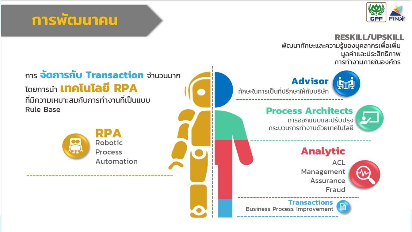 ศูนย์ Shared Services Center (SSC) ศูนย์ปฏิบัติการด้านบัญชีและการเงิน ซีพีเอฟ เข้าสู่ยุคที่ 3 คือการพัฒนาก้าวเข้าสู่ยุค Digital Economy 4.0 มีการนำเทคโนโลยีและนวัตกรรมสมัยใหม่มาประยุกต์ใช้ในการทำงานด้านกระบวนการทำงานและประมวลผลข้อมูล มีการพัฒนาหุ่นยนต์นักบัญชี หรือ Robotic Process Automation (RPA) ขึ้นมาทดแทนการทำงานที่มีลักษณะประจำหรือ Routine Work ทำให้เพิ่มประสิทธิภาพในการทำงาน ลดต้นทุนทางธุรกิจ และลดระยะเวลาในการทำงานได้อย่างชัดเจน