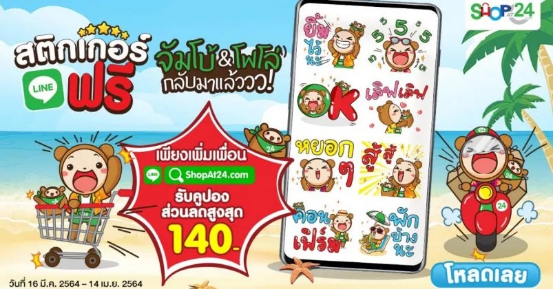 ไม่เพียงแค่ได้สติกเกอร์ไลน์ “จัมโบ้ & โฟโล่” ไปใช้งานกันฟรี! ส่วนวิธีการรับก็ง่ายมากเพียงแค่เพิ่มเพื่อน @ShopAt24.com นอกจากนี้การกด “เพิ่มเพื่อน” ยังไม่จบแต่เพียงแค่นั้น ยังมีการมอบสิทธิพิเศษหลายอย่างแก่ลูกค้าไม่ว่าจะเป็น