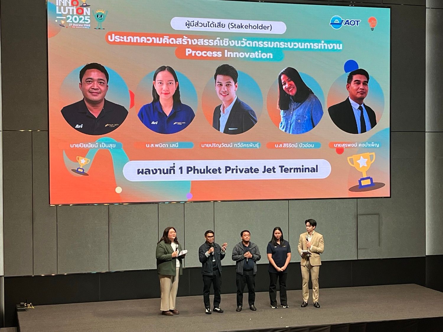 เมื่อเร็วๆนี้ บริษัท ท่าอากาศยานแห่งประเทศไทย (AOT) ได้จัดงาน Innolution 2025 เพื่อส่งเสริมแนวคิดนวัตกรรมในองค์กร โดยเปิดโอกาสให้บริษัทพันธมิตรและผู้ประกอบการร่วมเสนอผลงานในหลากหลายประเภท ซึ่งบริษัท สยามแลนด์ฟลายอิ้ง บริษัทในเครือซีพี ได้ส่งโครงการ Phuket Private Jet Terminal เข้าร่วมประกวดในหัวข้อ กระบวนการทำงาน (Process Innovation – Stakeholder) และสามารถคว้ารางวัลชนะเลิศไปครองได้อย่างภาคภูมิ ด้วยการนำเสนอเทอร์มินัลการบินส่วนบุคคลที่ผสานเทคโนโลยีล้ำสมัย เช่น ระบบ STAX และ FBO One เข้ากับแนวทางการดำเนินงานที่เป็นมิตรต่อสิ่งแวดล้อมผ่านการใช้เครื่องมือภาคพื้นดินแบบไฟฟ้า 100% พร้อมทั้งออกแบบกระบวนการให้บริการที่สอดคล้องกับมาตรฐาน ICAO, ACI และ CAAT ซึ่งช่วยเพิ่มขีดความสามารถในการรองรับการให้บริการลานจอดอากาศยานเพิ่มมากขึ้นส่งผลให้รายได้เพิ่มขึ้นถึง 67% และคาดว่าจะคืนทุนภายใน 4 เดือน โดยมีทีมผู้เสนอผลงานในรอบสุดท้าย ได้แก่ คุณสุรพงษ์ คงบำเพ็ญ, คุณปิยนัยน์ เป็นสุข และคุณพนิดา เสนี ซึ่งความสำเร็จครั้งนี้สะท้อนถึงความมุ่งมั่นของสยามแลนด์ฟลายอิ้งในการยกระดับมาตรฐานการให้บริการด้านการบินส่วนบุคคล พร้อมทั้งสนับสนุนยุทธศาสตร์ของ AOT ในการพัฒนาท่าอากาศยานให้เป็นมิตรกับสิ่งแวดล้อมและตอบโจทย์ผู้โดยสารระดับพรีเมียม