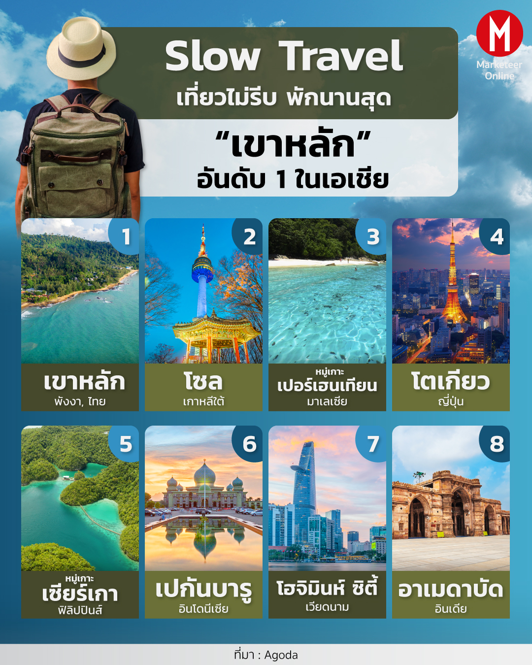 จาก 8 ประเทศ ในทวีปเอเชีย จุดหมายปลายทางที่นักท่องเที่ยวอยู่เที่ยวนานที่สุด ได้แก่ เขาหลัก (ไทย), โซล (เกาหลีใต้), หมู่เกาะเปอร์เฮนเทียน (มาเลเซีย), โตเกียว (ญี่ปุ่น), เกาะเซียร์เกา (ฟิลิปปินส์), เปกันบารู (อินโดนีเซีย), โฮจิมินห์ ซิตี (เวียดนาม) และอาเมดาบัด (อินเดีย) ตามลำดับ อโกด้ารวบรวมข้อมูลการจองบนแพลตฟอร์มของอโกด้าในช่วง 3 เดือนแรกของปี 2567 แล้วจึงนำมาวิเคราะห์เพื่อจัดอันดับ**