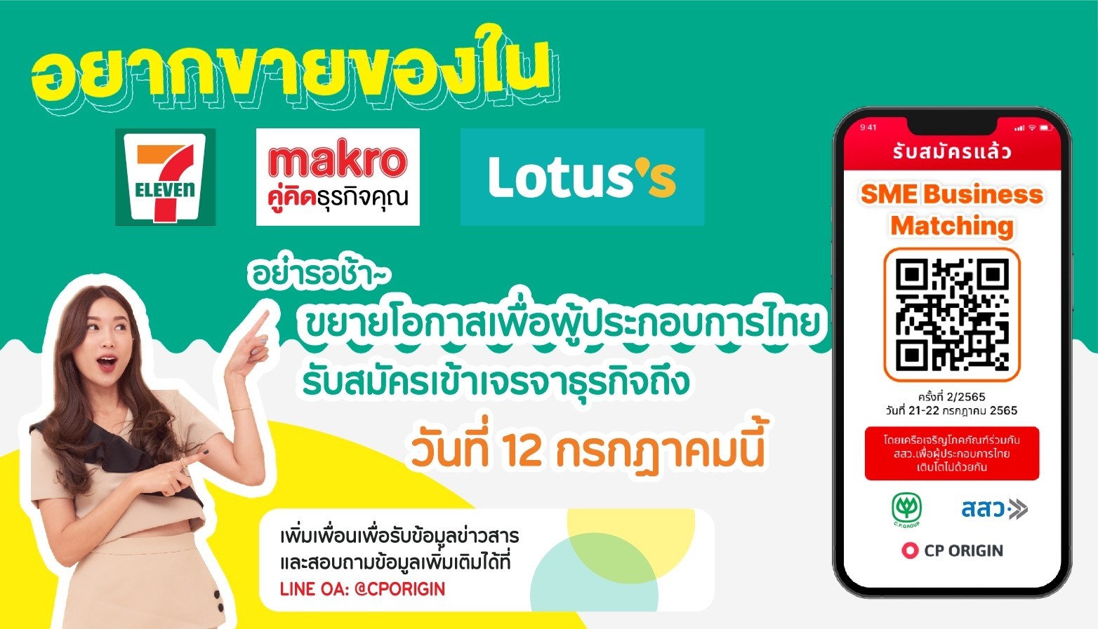 จากความร่วมมือของ สสว. X เครือเจริญโภคภัณฑ์ เปิดโอกาสให้ผู้ประกอบการ SME และ เกษตรกรไทย ได้เข้าร่วม เจรจาธุรกิจ SME BUSINESS MATCHING ครั้งที่ 2/2565 ในวันที่ 21-22 กรกฎาคม 2565 เพื่อเข้าจำหน่ายสินค้าใน📍 7-ELEVEN , แม็คโคร และ โลตัส 📍ผ่านแพลตฟอร์มแห่งโอกาส