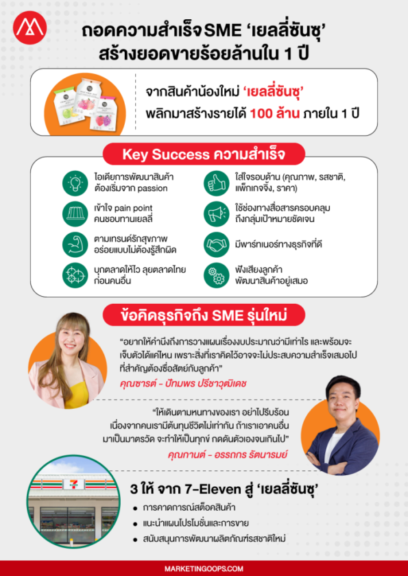 เปิดเบื้องลึกความสำเร็จ ‘เยลลี่ซันซุ’ ของ ‘ซารต์-ปัทมพร ปรีชาวุฒิเดช’ และ ‘กานต์-อรรถกร รัตนารมย์’ ยูทูปเบอร์ชื่อดัง เจ้าของช่อง Bearhug ที่มีผู้ติดตามกว่า 3 ล้านราย ซึ่งวันนี้ได้มาสวมบทบาทเป็น SMEs น้องใหม่ ที่สามารถสร้างชื่อและเติบโตท่ามกลางวิกฤตโรคระบาดด้วยการมียอดขายหลักร้อยล้านบาทภายใน 1 ปี