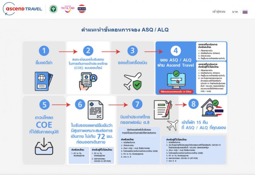 คุณเกริกพงศ์ งาทวีสุข ผู้จัดการทั่วไป บริษัท แอสเซนด์ แทรเวิล จำกัด กล่าวว่า Ascend Travel เป็นแพลตฟอร์มสัญชาติไทย 100% ที่เข้าใจถึงปัญหา และสนับสนุนผู้ประกอบการไทยเพื่อนักเดินทาง โดยปัจจุบันทางบริษัทฯ ได้พัฒนาแพลตฟอร์มเดิมที่ใช้งานอยู่แล้ว ให้มีฟังก์ชั่นเพิ่มขึ้นด้วยการมีแพลตฟอร์มออนไลน์ในการจองแพ็คเกจโรงแรมสถานกักกันโรคแห่งรัฐทางเลือก (ASQ/ALQ) ซึ่งจะเป็นอีกหนึ่งทางเลือกในการรวบรวมข้อมูลเกี่ยวกับโรงแรมที่พัก ASQ/ALQ โดยผู้ที่เดินทางจากต่างประเทศเข้ามายังประเทศไทย สามารถค้นหาโรงแรมที่ผ่านมาตรฐานโรงแรม ASQ/ALQ ได้ที่ https://asq.ascendtravel.com ซึ่งแพลตฟอร์มนี้จะครอบคลุมโรงแรม ASQ/ALQ ทั้งหมดในประเทศไทยกว่า 100 แห่ง ตั้งแต่ 3 – 5 ดาว เพื่อให้ผู้เดินทางหรือนักท่องเที่ยวสามารถเลือกจองที่พักได้ตามความต้องการ