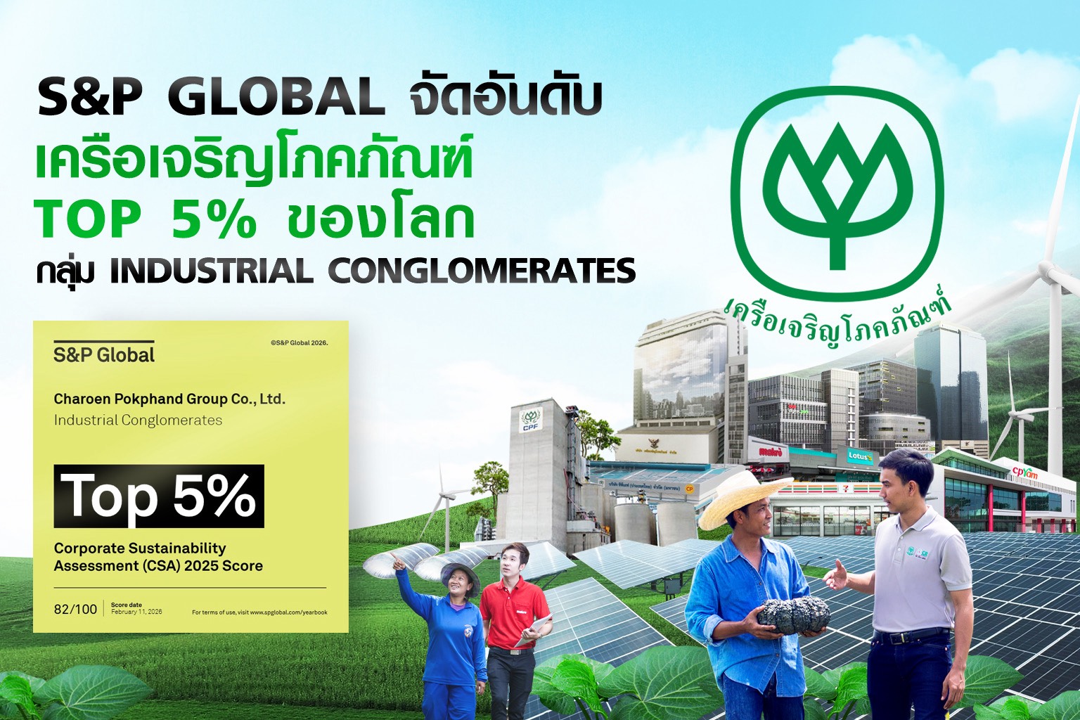 วันที่ 25 กุมภาพันธ์ 2569 — เครือเจริญโภคภัณฑ์ (CP Group) ได้รับการจัดอันดับ Top 5% ในกลุ่มอุตสาหกรรม Industrial Conglomerates จากการประกาศผล The Sustainability Yearbook 2026 โดย S&P Global ด้วยคะแนนประเมิน 82 จาก 100 คะแนน นับเป็นการติดอันดับต่อเนื่องเป็นปีที่ 5 โดยการจัดอันดับปีนี้มีบริษัทจากทั่วโลกกว่า 9,200 แห่งเข้าร่วมการประเมิน และมีเพียง 848 บริษัทที่ได้รับการคัดเลือกเข้าสู่ Sustainability Yearbook สะท้อนมาตรฐานการประเมินที่เข้มข้น โดยในกลุ่ม Industrial Conglomerates มีบริษัทเข้าร่วม 95 แห่ง และมีเพียง 5 บริษัทที่ได้คะแนนสูงสุดในกลุ่ม ได้แก่ Keppel (สิงคโปร์), CP Group (ไทย), Siemens (เยอรมนี), SK Inc (เกาหลีใต้) และ Metlen Energy & Metal (กรีซ)