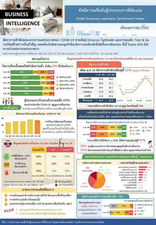 ธนาคารแห่งประเทศไทย (ธปท.) ร่วมกับสมาคมโรงแรมไทย เปิดเผยดัชนีความเชื่อมั่นผู้ประกอบการที่พักแรม (Hotel business operator Sentiment Index : HSI) เดือนม.ค. 65 พบว่า อัตราการเข้าพักลดลงจากการแพร่ระบาดของไวรัสโควิด-19 สายพันธุ์โอมิครอนในประเทศ และการยกเลิก Test&Go รายใหม่ชั่วคราวเป็นสำคัญ สอดคล้องกับสัดส่วนของลูกค้าที่ยกเลิกการจองห้องพักที่เพิ่มขึ้นจากเดือนก่อน ทั้งนี้ โรงแรม 42% ยังมีความกังวลต่อการแพร่ระบาดมาก