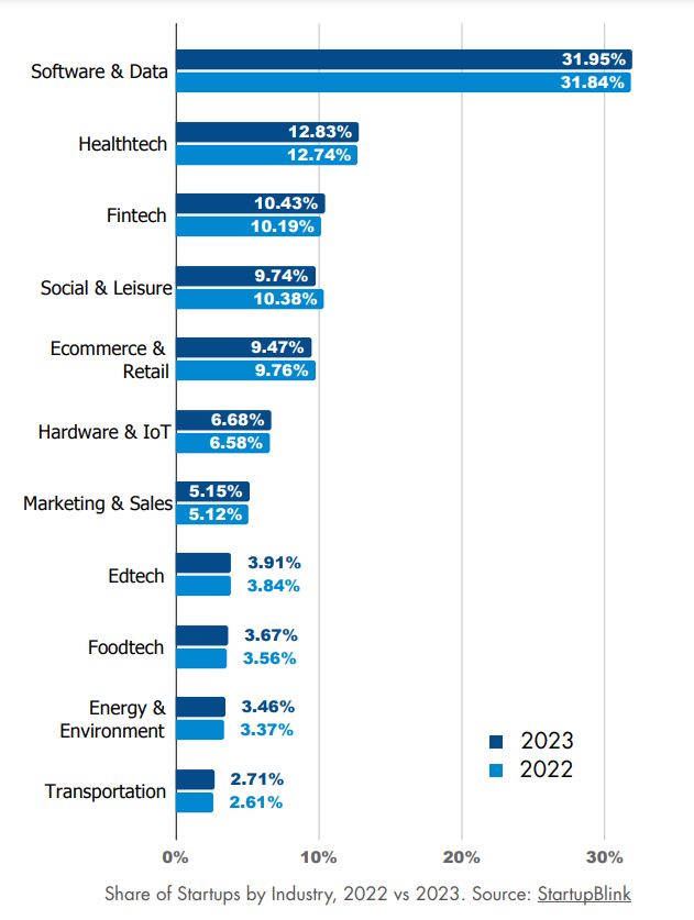 StartupBlink ศูนย์วิจัยและเก็บข้อมูลสถิติเกี่ยวกับธุรกิจสตาร์ทอัพทั่วโลก ได้รายงาน Global Startup Ecosystem Index 2023 เพื่อเผยให้เห็นถึงความเคลื่อนไหวที่เกิดขึ้นกับระบบนิเวศสตาร์ทอัพในกว่า 100 ประเทศ โดยเริ่มไล่เลียงจากภาพใหญ่ในรายอุตสาหกรรมก่อน