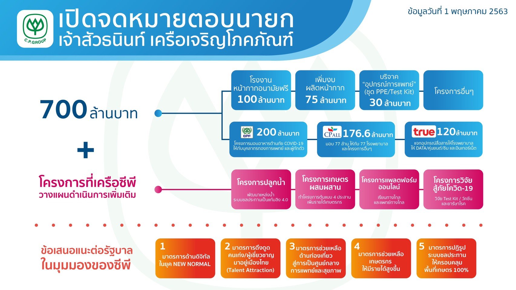 ในสถานการณ์วิกฤตเช่นนี้ เครือฯ ถือเป็นหน้าที่รับผิดชอบและต้องทำเพื่อประเทศไทย ซึ่งท่านประธานอาวุโส ธนินท์ เจียรวนนท์ ได้เขียนไว้ตอนหนึ่งของจดหมายตอบกลับไปยังนายกรัฐมนตรีว่าเครือฯ พร้อมให้การสนับสนุนรัฐบาลให้แก้ไขปัญหาในสถานการณ์โควิด-19 อย่างเต็มที่ พร้อมทั้ง เปิดเผยสิ่งที่เครือทำไปแล้ว และสิ่งที่กำลังจะทำ เพื่อช่วยประชาชนคนไทยรอดพ้นวิกฤตไปด้วยกัน
