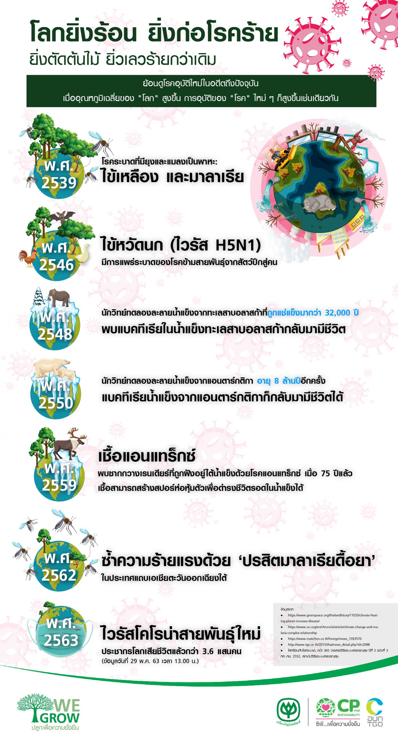 We Are CP มีผลสำรวจการเกิดโรคอุบัติใหม่ที่สันนิษฐานว่า มีปัจจัยส่งเสริมจากการที่อุณหภูมิโลกสูงขึ้น เปรียบเทียบได้ว่าสภาพภูมิอากาศคือ “ชนวน” เชื้อโรคคือ “กระสุน”