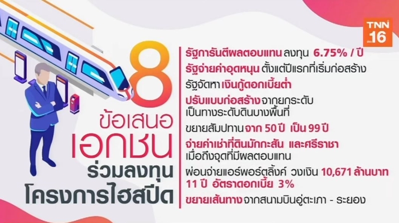 สำหรับโครงการรถไฟความเร็วสูงเชื่อม 3 สนามบิน ดูแล้วผลประโยชนน่าจะลงตัวทั้งฝั่งรัฐและเอกชน แต่ความเสี่ยงนั้น ดูเหมือนภาระจะอยู่ที่ภาคเอกชนทั้งหมด เพราะภาครัฐใช้เงื่อนไขปิดความเสี่ยงทุกด้าน ตั้งแต่การจ่ายเงินร่วมทุนจำนวน 149,650 ล้านบาท ที่ไม่จ่ายในปีแรก แต่จ่ายในปีที่ 6 และทยอยจ่ายนาน 10 ปี ขณะที่เอกชนต้องหาเงินก้อนโตมาลงทุนใน 5 ปีแรก