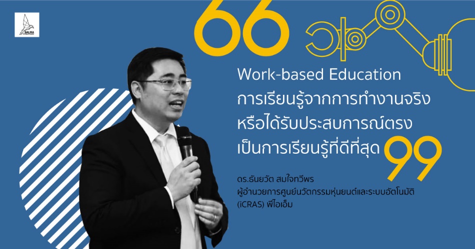 A : Work-based Education เป็นการเรียนการสอนที่เรียนรู้จากการลงมือปฏิบัติงานจริง คือการเรียนทฤษฎีควบคู่กับการฝึกปฏิบัติงานด้วยการใช้โจทย์จริง จากบริษัทที่ใช้งานหุ่นยนต์จริง จึงทำให้นักศึกษาได้องค์ความรู้ที่เข้มข้นกว่าการเรียนในห้องเรียนเพียงอย่างเดียว ซึ่งผลงานที่เกิดจากการสร้างสรรค์และนำไปใช้จริงก็เป็นความภูมิใจของนักศึกษาเอง
