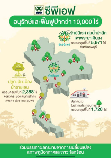 ทั้งนี้ “ป่าเลน” ก็คือ โครงการ “ปลูก ปัน ป้อง ป่าชายเลน” เป็นยุทธศาสตร์หนึ่งของ CPF ซึ่งมีโครงการอยู่ตลอดชายฝั่งทะเลของประเทศไทยใน 5 จังหวัด คือ ระยอง, สมุทรสาคร, ชุมพร, สงขลา และพังงา ส่วน “ป่าบก” ก็คือ โครงการรักษ์นิเวศน์ ซึ่งแบ่งออกเป็น 2 ส่วน คือ