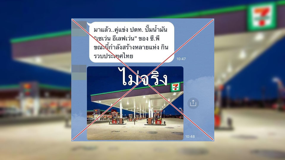 สืบเนื่องจากกรณีที่มีการส่งต่อข้อความผ่านทางแอพพลิเคชั่นไลน์ โดยระบุว่า “มาแล้ว..คู่แข่ง ปตท. ปั๊มน้ำมัน “เซเว่น อีเลฟเว่น” ของ ซี.พี. ขณะนี้กำลังสร้างหลายแห่ง กินรวบประเทศไทย” นั้น ทางสำนักสื่อสารองค์กร บมจ.ซีพีออลล์ ผู้ดำเนินธุรกิจร้าน เซเว่น อีเลฟเว่น ในประเทศไทย ยืนยันว่าข้อความ/ภาพที่ส่งต่อกันนั้นเป็นเท็จ หรือ Fake news เซเว่น อีเลฟเว่นไม่ได้ดำเนินธุรกิจสถานีบริการน้ำมันในประเทศไทยแต่อย่างใด ขอชาวซีพีช่วยสื่อสารทำความเข้าใจที่ถูกต้องกับสังคม