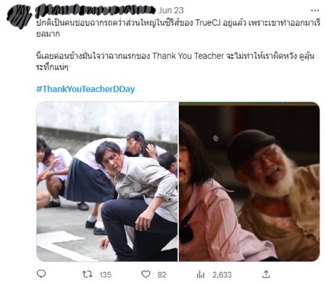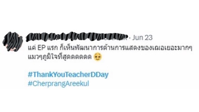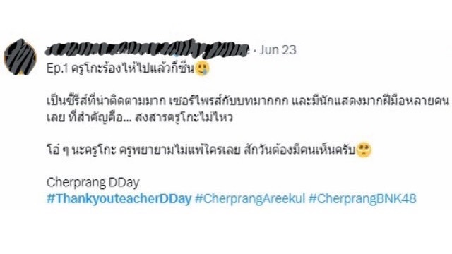 ล่าสุดหลังจากซีรีส์ออกอากาศให้ชมแบบต่อเนื่อง 7 ตอนรวด ก็ไม่ทำให้คอซีรีส์ผิดหวังสมกับเป็นงานคุณภาพโปรดักชั่นเจ๋งของ ทรู ซีเจ ครีเอชั่นส์ เพราะแฟนๆ ต่างออกมาชื่นชมผ่านโลกโซเชียลมีเดียมีการแชร์เรื่องราวสุดประทับใจและพูดถึงซีรีส์กันอย่างต่อเนื่อง เตรียมขึ้นแท่นซีรีส์น้ำดีสะท้อนสังคมที่มีความสมจริง เพราะเนื้อหาบางช่วงบางตอนก็มีเกิดขึ้นในโรงเรียนจริงๆ จนคนดูคาดไม่ถึงเพราะเป็นเรื่องใกล้ตัว และที่สำคัญเรื่องราวต่างๆ ก็สามารถเข้าถึงได้ง่าย บวกกับฝีมือการแสดงที่ไม่เคยหยุดนิ่งของ เฌอปราง อารีย์กุล ในบทของ “โกะ” ครูภาษาไทย (อัตราจ้าง) ที่ถ่ายทอดออกมาได้อย่างลึกซึ้งทุกอารมณ์ความเป็นคุณครูทั้งสีหน้าแววตา น้ำเสียงการสื่อสารที่เฌอปรางถ่ายทอดเป็นตัวละคร โกะ ในแต่ละตอน กลายเป็นครูโกะที่คนดูหลงรักอยากลุ้นเอาใจช่วยเธอทุกเรื่อง ไหนจะฝีมือการแสดงของเฌอปรางเรียกได้ว่าก็ไต่ระดับขึ้นเรื่อยๆ จนคอซีรีส์ประทับใจไปตามๆ กัน รวมถึงฉาก CG ฉากรถคว่ำ ก็ไม่ทำให้ผิดหวัง เพราะทีมงานพิถีพิถันสร้างสรรค์ทุ่มเททุกขั้นตอนให้ออกมาสมจริงเพื่อความสมบูรณ์แบบกระแทกใจสายโปรดักชั่นไปเต็มๆ เรียกว่าเป็นเป็นซีรีส์อีกเรื่องที่คนดูไม่ควรพลาดกับเรื่องราวชีวิตและอาชีพครู ในมุมที่ไม่เคยมีมาก่อน ใน ซีรีส์ “Thank You Teacher”