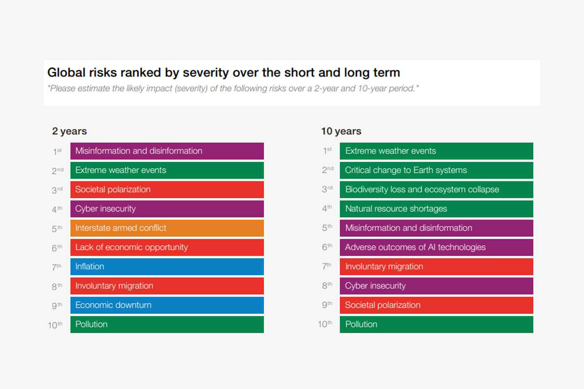 รายงาน Global Risks Report 2024 ได้สรุปความเสี่ยงและปัญหาต่าง ๆ ที่อาจส่งผลกระทบต่อโลกทั้งในปี 2024 และคาดการณ์อนาคตใน 2 ปีข้างหน้าและอีก 10 ปีข้างหน้า มาดูกันว่าความเสี่ยงที่เจออยู่ในปัจจุบัน จะส่งผลต่อระยะยาวอย่างไรบ้าง