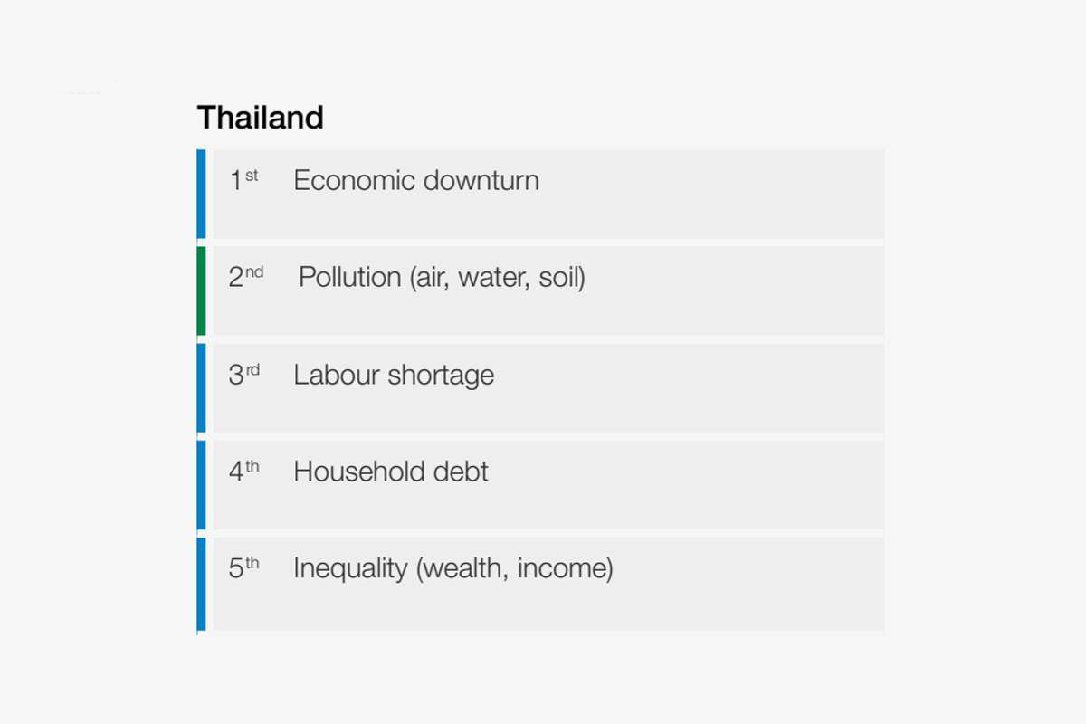 ผู้บริหารในไทยลงความเห็นว่าภัยคุกคาม 5 ประการนี้ สามารถส่งผลกระทบเชิงลบต่อประเทศไทยได้มากที่สุด ดังนี้