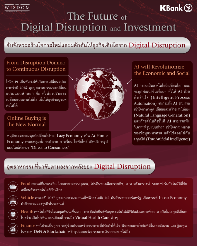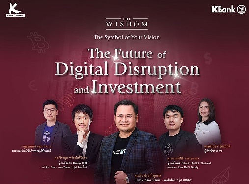 เมื่อเร็ว ๆ นี้ธนาคารกสิกรไทย จัดงานสัมมนาออนไลน์ด้านเศรษฐกิจและการลงทุน หัวข้อ “THE WISDOM The Symbol Of Your Vision: The Future of Digital Disruption and Investment” ให้แก่กลุ่มลูกค้าเดอะวิสดอม เพื่อทำความเข้าใจโลกและการลงทุนในอนาคต เป็นการเปิดมุมมองพร้อมรับมือและคว้าโอกาสในการลงทุนที่ดีกว่าเดิม