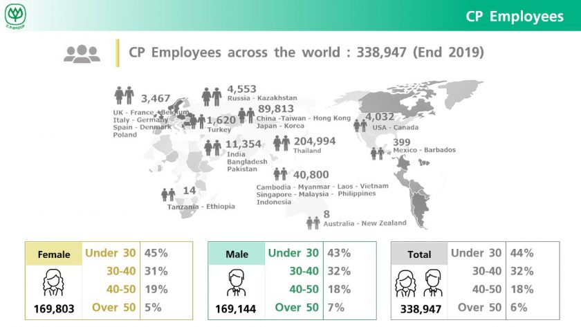 จากข้อมูล ณ ปลายปี 2562 เครือซีพีมีพนักงานทั่วโลกประมาณ 3.4 แสนคน โดยมีอัตราส่วนของพนักงานหญิงและชายใกล้เคียงกัน และมีพนักงานช่วงวัยต่างๆ ทำงานร่วมกัน ซึ่งพบว่า พนักงานร้อยละ 76 เป็น Gen Y