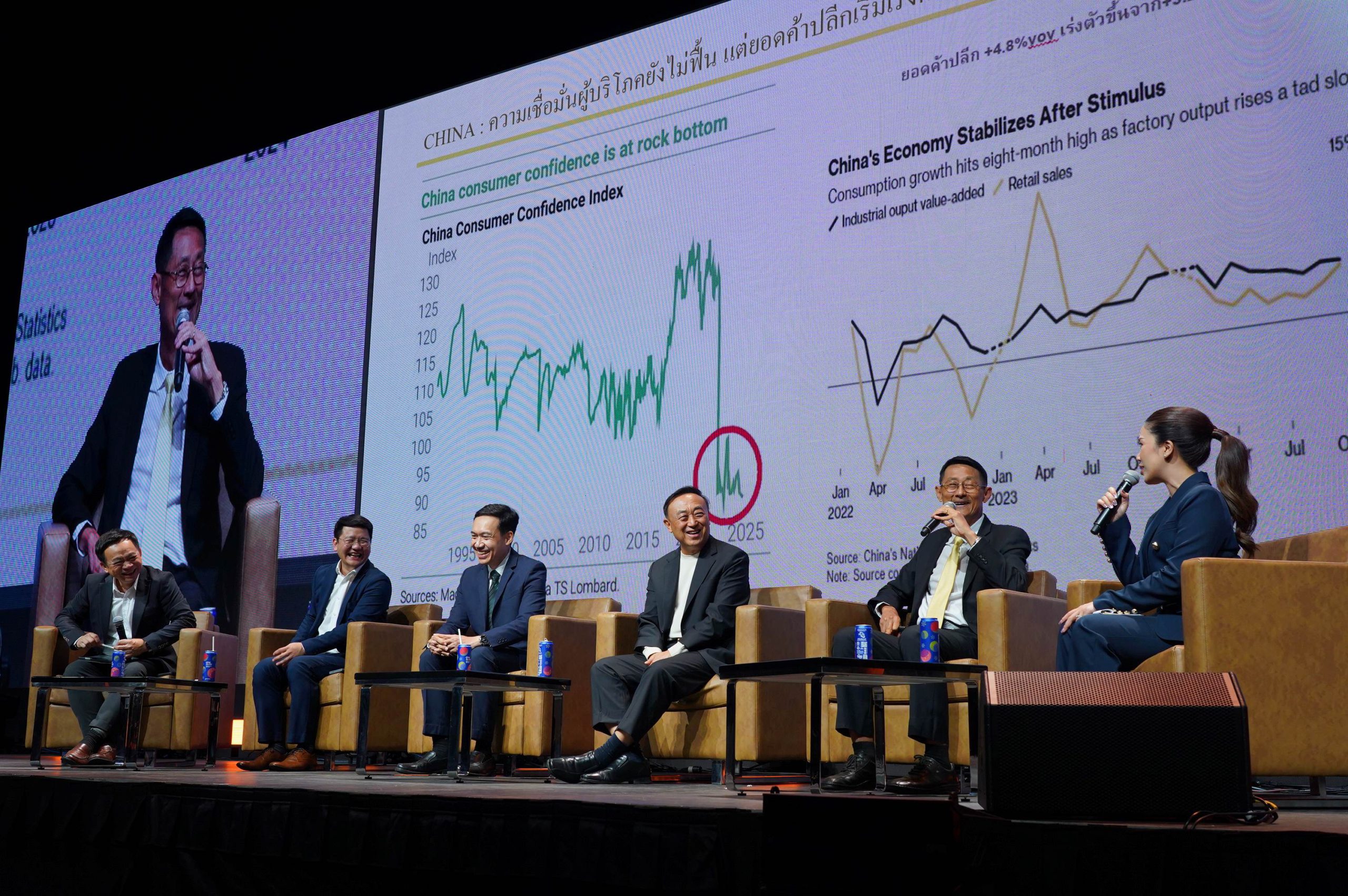 สำหรับการเสวนาช่วงเช้า ในหัวข้อ “เศรษฐกิจโลก เศรษฐกิจไทย เมื่อทรัมป์หวนคืนทำเนียบขาว” ได้รับเกียรติจาก นายเกรียงไกร เธียรนุกุล ประธานสภาอุตสาหกรรมแห่งประเทศไทย (ส.อ.ท.) กล่าวถึง นโยบาย “ทรัมป์ 2.0” เป็นที่จับตามองของทั่วโลก เนื่องจากมีความแตกต่างจากนโยบายของรัฐบาลโจ ไบเดน โดยทั่วโลกกำลังรอดูว่าทรัมป์จะสามารถดำเนินนโยบายที่หาเสียงไว้ได้มากน้อยเพียงใด ภายใต้นโยบาย America First เพื่อดึงดูดการลงทุนกลับประเทศสหรัฐฯ ทางด้าน นายพูนพงษ์ นัยนาภากรณ์ ผู้อำนวยการสำนักงานนโยบายและยุทธศาสตร์การค้า (สนค.) กระทรวงพาณิชย์ เผยว่า เศรษฐกิจโลกในปีนี้ยังต้องรอประเมินในวันที่ 20 มกราคม 2568 เมื่อทรัมป์เข้ารับตำแหน่งประธานาธิบดี เนื่องจากต้องดูความชัดเจนของนโยบายทรัมป์ว่าจะดำเนินตามที่หาเสียงไว้ได้หรือไม่ โดยนโยบายทรัมป์เน้นการปกป้องสินค้าภายในประเทศ ซึ่งจะส่งผลกระทบต่อประเทศที่ส่งออกมายังสหรัฐฯ ดังนั้น โอกาสของไทยภายใต้นโยบายทรัมป์คือการส่งสินค้าทดแทนไปยังประเทศที่ได้รับผลกระทบจากนโยบาย “ทรัมป์ 2.0” ต่อด้วยวิสัยทัศน์ของ นางสาวฐาปนีย์ เกียรติไพบูลย์ ผู้ว่าการการท่องเที่ยวแห่งประเทศไทย กล่าวถึง นโยบายของทรัมป์ส่งผลดีต่อภาคการท่องเที่ยวของไทย เนื่องจากการแข็งขึ้นของค่าเงินบาทและแนวโน้มราคาน้ำมันที่ลดลง ทำให้ราคาบัตรโดยสารในเส้นทางไกลมีแนวโน้มลดลง ซึ่งจะช่วยดึงดูดนักท่องเที่ยวมาเยือนไทยได้มากขึ้น ผู้ประกอบการไทยจึงต้องเตรียมพร้อมรับมือกับลูกค้าจากทุกตลาด พร้อมทั้งนำอัตลักษณ์ไทยและซอฟพาวเวอร์ไทยมาเสริม เชื่อว่าจะสามารถดึงดูดนักท่องเที่ยวจากสหรัฐอเมริกาได้มากขึ้น