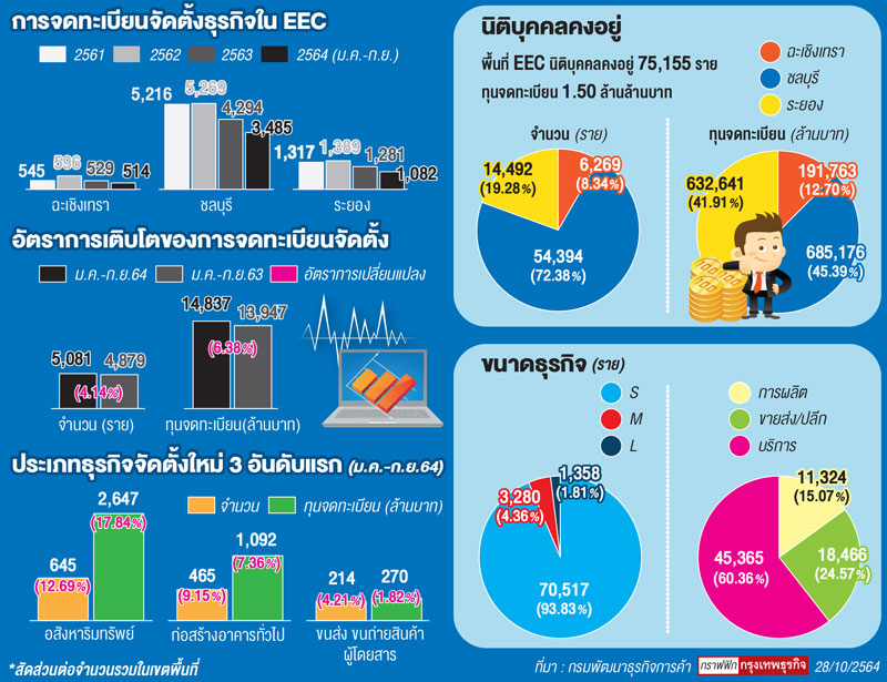 ในขณะที่จำนวนนิติบุคคลคงอยู่ในอีอีซี ณ วันที่ 30 ก.ย.2564 มีจำนวน 75,155 ราย ทุนจดทะเบียนรวม 1.50 ล้านล้านบาท แบ่งเป็น