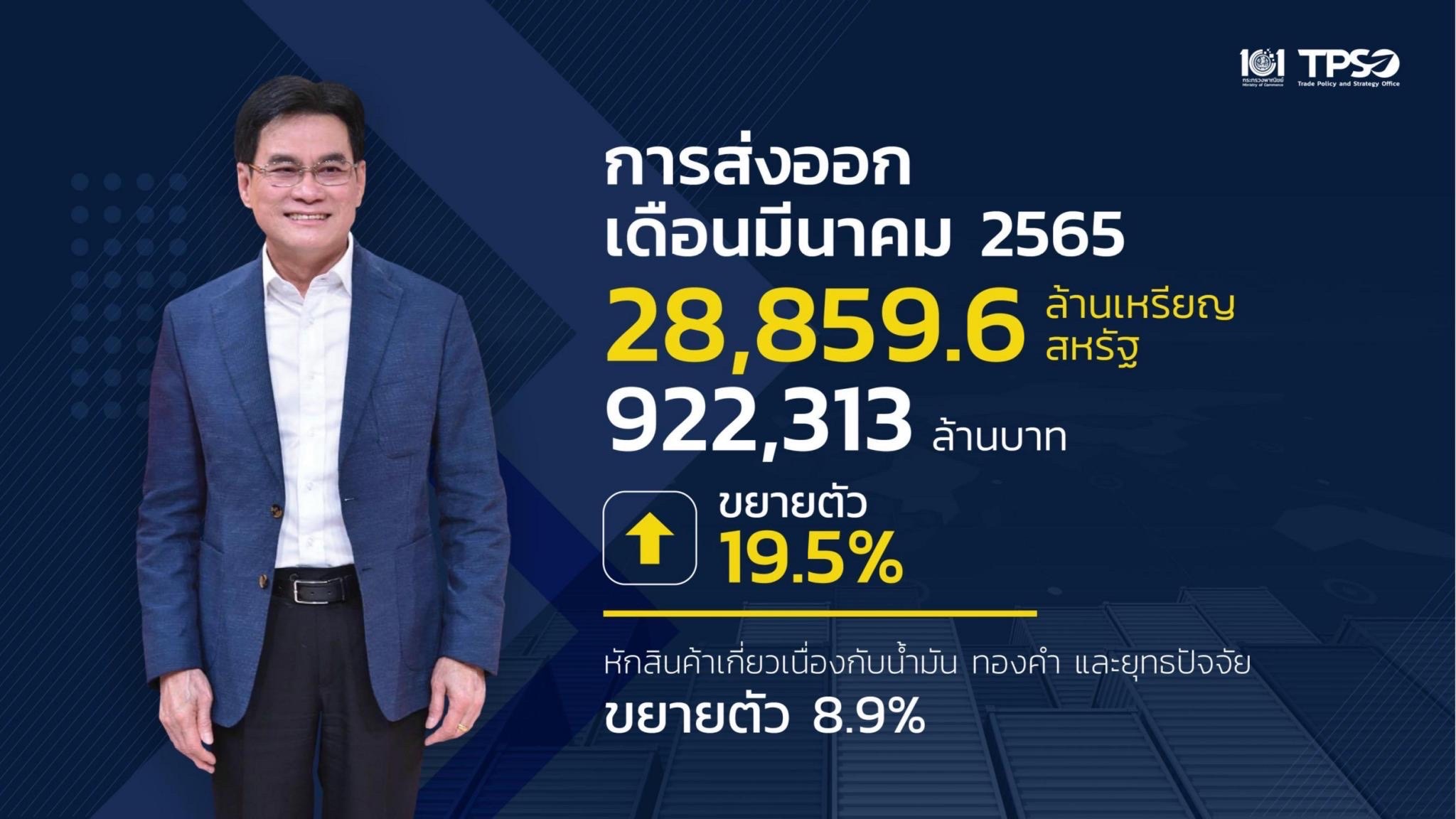 นายจุรินทร์ ลักษณวิศิษฏ์ รองนายกรัฐมนตรีและรัฐมนตรีว่าการกระทรวงพาณิชย์ เปิดเผยว่า การส่งออกของไทยเดือนมีนาคม 2565 ขยายตัว 19.5% มีมูลค่า 28,859 ล้านเหรียญสหรัฐ ถือว่ามูลค่าการส่งออกสูงที่สุดในรอบ 30 ปี นับตั้งแต่มีการบันทึกสถิติการส่งออกตั้งแต่ปี 2534 ขณะที่การนำเข้า ขยายตัว 18.0% มีมูลค่า 27,400 ล้านเหรียญสหรัฐ ส่งผลให้ไทยได้ดุลการค้า 1,459 ล้านเหรียญสหรัฐ การส่งออกที่ขยายตัวเป็นผลมาจาก สินค้าสำคัญ 3 หมวดประกอบด้วย 1.สินค้าการเกษตร 2.สินค้าเกษตรอุตสาหกรรม และ 3.สินค้าอุตสาหกรรม มีการเติบโต