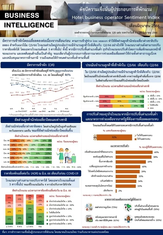 ธนาคารแห่งประเทศไทย (ธปท.) เผยดัชนีความเชื่อมั่นผู้ประกอบการที่พักแรม เดือนมิ.ย.66 พบว่า อัตราการเข้าพักโดยเฉลี่ยอยูที่ 46% ลดลงต่อเนื่องจากเดือนพ.ค. ซึ่งเฉลี่ยอยู่ที่ 51% ตามการเข้าสู่ช่วง low season ทำให้สัดส่วนลูกค้านักท่องเที่ยวต่างชาติปรับลดลง ขณะที่คาดการณ์อัตราการเข้าพักเดือนก.ค.66 โดยเฉลี่ยอยู่ที่ 46%