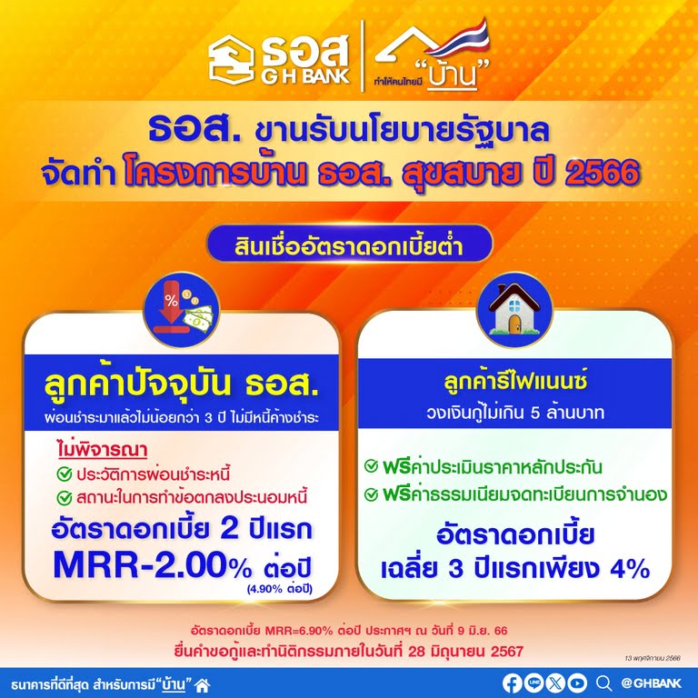 2. สินเชื่ออัตราดอกเบี้ยต่ำสำหรับลูกค้ากู้ใหม่ ที่ต้องการรีไฟแนนซ์บ้าน หรือห้องชุด (คอนโดมิเนียม) จากสถาบันการเงินอื่น กรอบวงเงิน 5,000 ล้านบาท วงเงินกู้สูงสุดไม่เกิน 5 ล้านบาทต่อหลักประกัน คิดอัตราดอกเบี้ยคงที่ตลอดระยะเวลา 3 ปี ปีที่ 1 เท่ากับ 3.75% ต่อปี ปีที่ 2 เท่ากับ 4.00% ต่อปี ปีที่ 3 เท่ากับ 4.25% ต่อปี ปีที่ 4-5 เท่ากับ MRR-2.00% ต่อปี (4.90% ต่อปี) ปีที่ 6-7 เท่ากับ MRR-1.50% ต่อปี (5.40% ต่อปี) และปีที่ 8 เป็นต้นไป