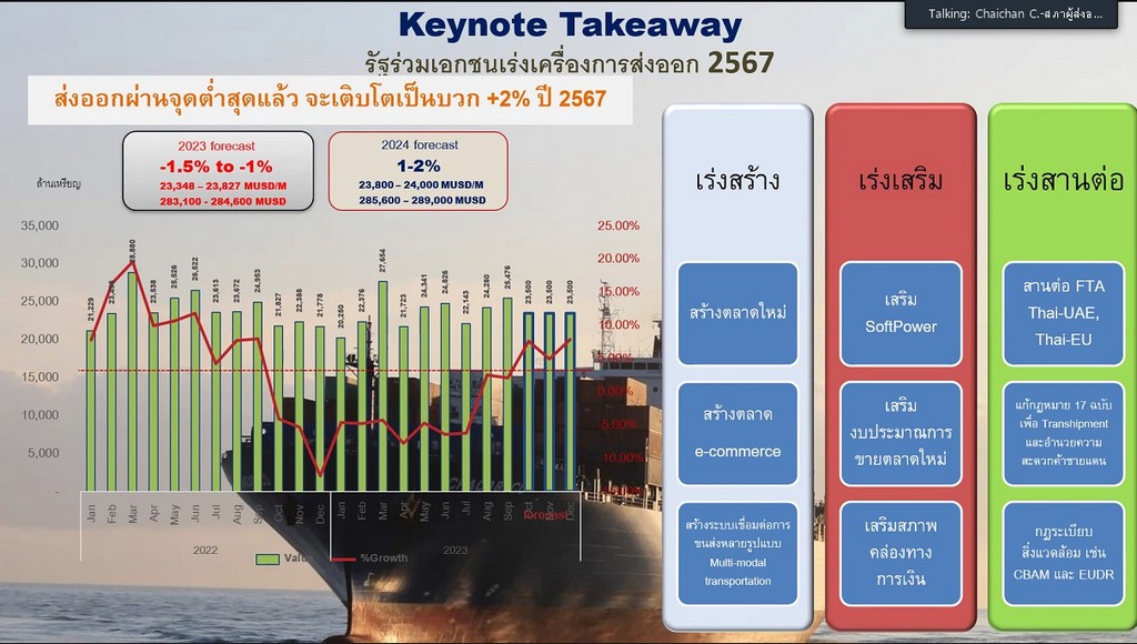 “แม้ปัจจัยภายนอกที่คาดเดาและควบคุมได้ยาก จะมีผลกระทบรุนแรง แต่วิกฤตการส่งออกของไทยได้ผ่านจุดต่ำสุดแล้วในปีนี้ และพร้อมที่จะเดินหน้าเติบโตอย่างต่อเนื่องในปี 2567 เราคาดว่าการส่งออกปีหน้า จะขยายตัวได้ราว 1-2% โดยมีสินค้าเกษตร อาหาร ยานยนต์และชิ้นส่วน เป็นตัวขับเคลื่อนหลัก” ประธาน สรท.ระบุ