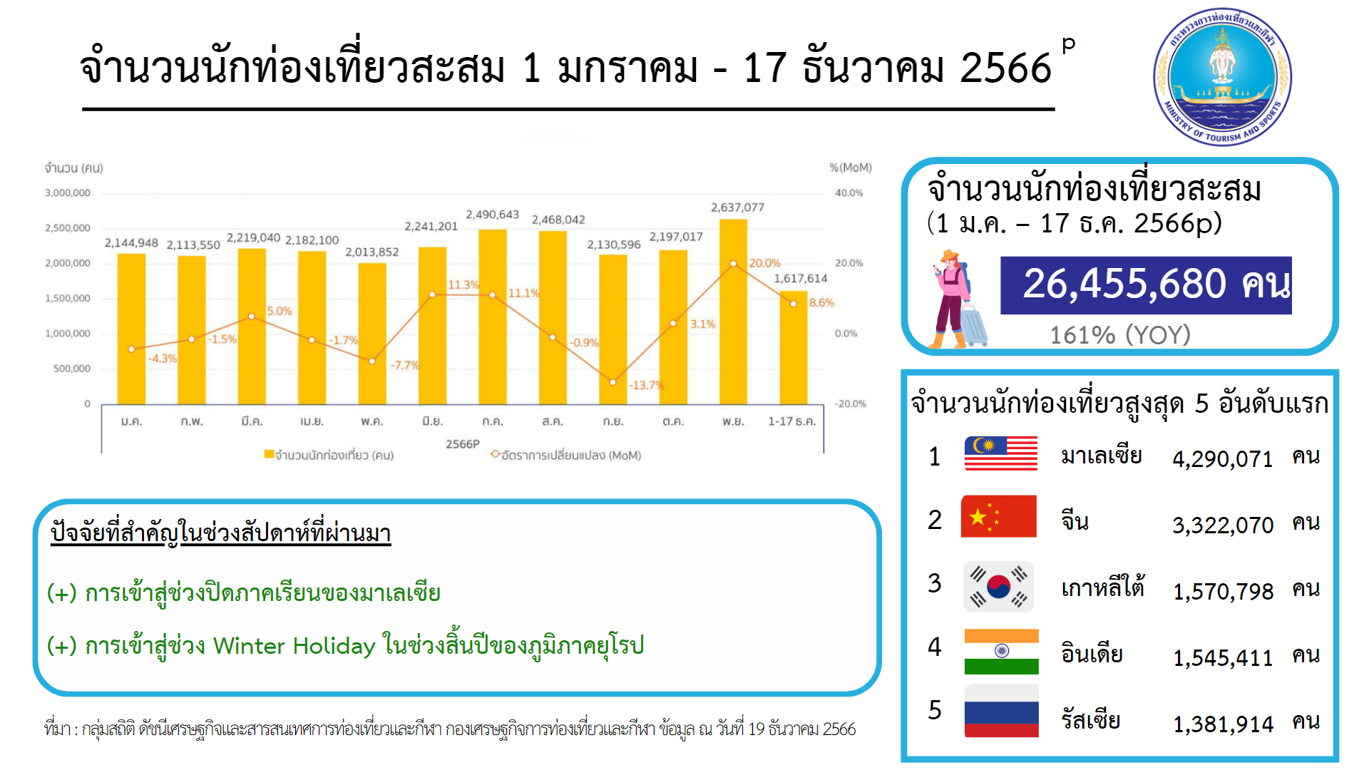 สำหรับจำนวนนักท่องเที่ยวสะสมตั้งแต่วันที่ 1 ม.ค. 66 ที่ผ่านมา ทั้งสิ้น 26,455,680 คน สร้างรายได้จากการใช้จ่ายของนักท่องเที่ยวต่างชาติแล้ว 1,129,080 ล้านบาท โดยนักท่องเที่ยวที่เดินทางเข้าไทยมากที่สุด 5 อันดับแรก ได้แก่ อันดับ 1 มาเลเซีย 4,290,071 คน รองลงมา คือ จีน 3,322,070 คน เกาหลีใต้ 1,570,798 คน อินเดีย 1,545,411 คน และรัสเซีย 1,381,914 คน ตามลำดับ