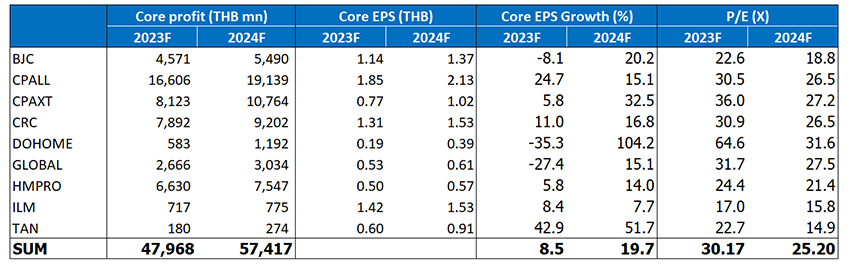 ด้าน กิจพณ ไพรไพศาลกิจ ผู้ช่วยกรรมการผู้จัดการ บล.ยูโอบี เคย์เฮียน (ประเทศไทย) ประเมินว่ากำไรของหุ้นกลุ่มค้าปลีกที่ บล.ยูโอบีฯ ออกบทวิเคราะห์ครอบคลุมจำนวน 4 บริษัท มีสัดส่วนประมาณ 49% ของมาร์เก็ตแคปรวมกลุ่มค้าปลีก ได้แก่ CPALL, บมจ.เบอร์ลี่ ยุคเกอร์ หรือ BJC, บมจ.คอมเซเว่น หรือ COM7, บมจ.โฮม โปรดักส์ เซ็นเตอร์ หรือ HMPRO รวมในปี 2567 จะอยู่ที่ประมาณ 3.59 หมื่นล้านบาท เติบโตประมาณ 17% จากปี 2566 ถือเป็นการเติบโตมากที่สุดในรอบ 3 ปี โดยในปีนี้มีหลายปัจจัยบวกเข้าสนับสนุน ทั้งนโยบายการกระตุ้นเศรษฐกิจภาครัฐทั้งการปรับขึ้นค่าแรงขั้นต่ำ, ดิจิทัลวอลเล็ต, Easy e-Receip รวมถึงมาตรการช่วยค่าครองชีพของประชาชนซึ่งจะมาช่วยกระตุ้นกำลังซื้อในปี 2567 ให้ดีขึ้นจากปี 2566