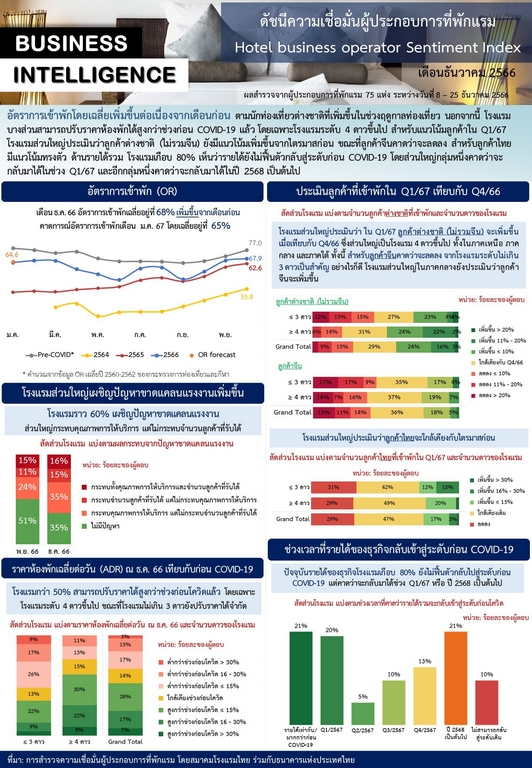 นอกจากนี้ โรงแรมบางส่วน ยังสามารถปรับราคาห้องพักได้สูงกว่าช่วงก่อนโควิด-19 แล้ว โดยเฉพาะโรงแรมระดับ 4 ดาวขึ้นไป ส่วนโรงแรมไม่เกิน 3 ดาว ยังปรับราคาได้จำกัด ในขณะที่โรงแรมส่วนใหญ่เกือบ 80% รายได้ยังไม่ฟื้นตัวกลับไปเทียบเท่าช่วงก่อนโควิด-19 โดยมีบางกลุ่ม คาดว่ารายได้จะกลับมาเทียบเท่าช่วงก่อนโควิดได้ในช่วงไตรมาส 1/67 และอีกกลุ่ม คาดว่ารายได้จะกลับมาได้ในปี 2568 เป็นต้นไป