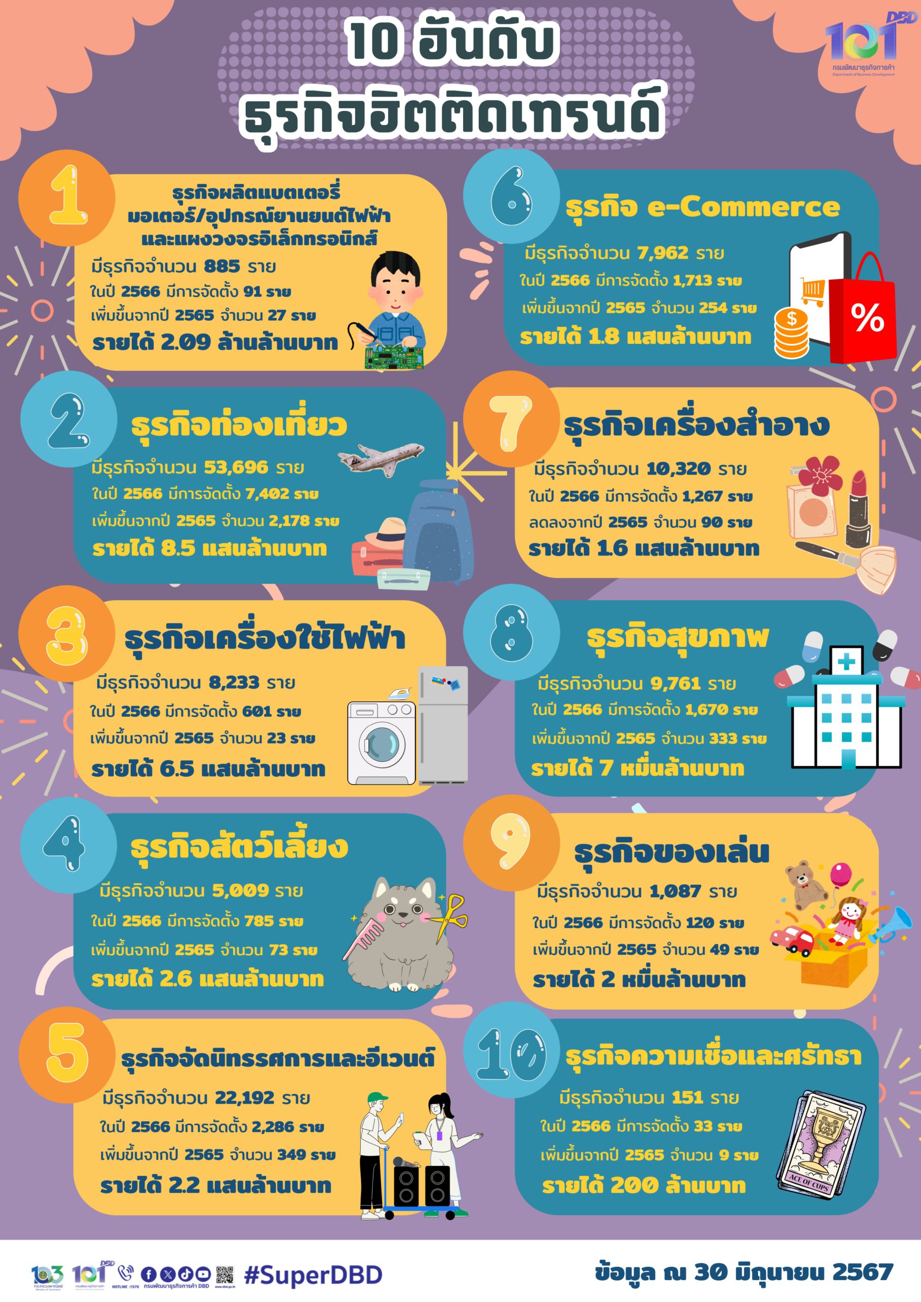 นางอรมน ทรัพย์ทวีธรรม อธิบดีกรมพัฒนาธุรกิจการค้า กระทรวงพาณิชย์ เปิดเผยว่า กรมพัฒนาธุรกิจการค้าได้ติดตามแนวโน้มการจดทะเบียนจัดตั้งธุรกิจใหม่เพื่อวิเคราะห์ทิศทางการเติบโตของธุรกิจในประเทศ ประกอบกับนำข้อมูลการนำส่งงบการเงินประจำปี 2566 (ข้อมูล ณ 30 มิถุนายน 2567) มาวิเคราะห์พบว่า ธุรกิจติดเทรนด์ที่มีการจัดตั้งเพิ่มขึ้นและยังทำรายได้ดีติดอันดับ ดังนี้