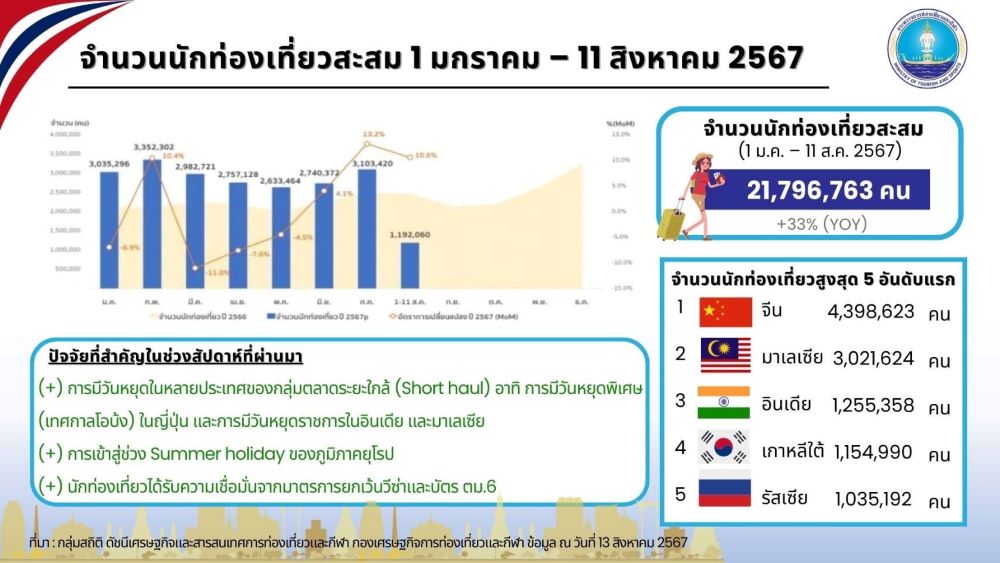 นายเสริมศักดิ์ พงษ์พานิช รมว.ท่องเที่ยวและกีฬา เปิดเผยว่า ล่าสุด ประเทศไทยมีจำนวนนักท่องเที่ยวสะสมตั้งแต่วันที่ 1 ม.ค.-11 ส.ค. 67 ที่ผ่านมา ทั้งสิ้น 21,796,763 คน สร้างรายได้จากการใช้จ่ายของนักท่องเที่ยวต่างชาติแล้วประมาณ 1,025,938 ล้านบาท โดยจำนวนนักท่องเที่ยวสูงสุด 5 อันดับแรก ได้แก่ จีน 4,398,623 คน มาเลเซีย 3,021,624 คน อินเดีย 1,255,358 คน เกาหลีใต้ 1,154,990 คน และรัสเซีย 1,035,192 คน