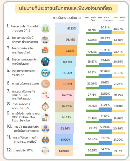 – นโยบายกระทรวงพาณิชย์ ที่ประชาชนรับทราบมากที่สุด 3 อันดับแรก คือ (1) โครงการประกันรายได้เกษตรกรปีที่ 2 (81.33%) ตามด้วย (2) โครงการพาณิชย์ลดราคา (76.45%) และ (3) โครงการส่งเสริมการค้าออนไลน์ (73.51%)
