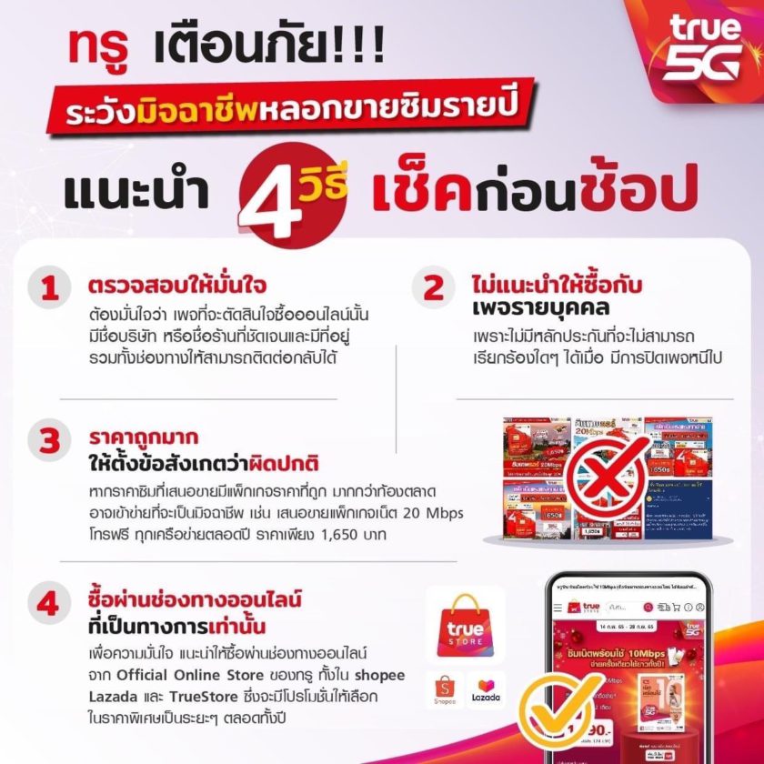 4. เพื่อความมั่นใจ แนะนำให้ซื้อผ่านช่องทางออนไลน์จาก Official Online Store ของทรู ทั้งใน Shopee Lazada และ TrueStore ซึ่งจะมีโปรโมชั่นให้เลือกในราคาพิเศษเป็นระยะๆ ตลอดทั้งปี