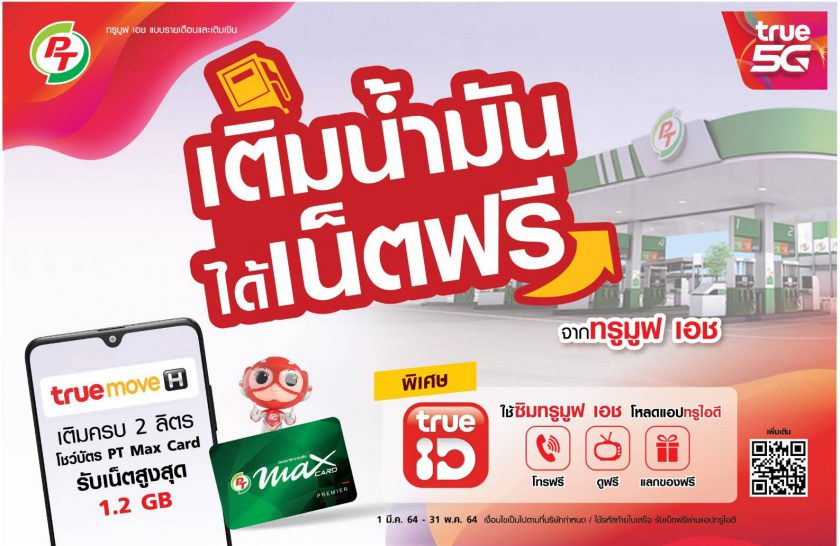 ทรู 5Gเครือข่ายอัจฉริยะ ที่เร็วกว่า แรงกว่า รายแรก รายเดียว ที่ครบสุดทุกย่านความถี่ผนึกพีทีจีบริษัทธุรกิจค้าปลีกน้ำมันเปิดตัวแคมเปญ “เติมน้ำมัน ได้เน็ตฟรี จากทรูมูฟ เอช” มอบสิทธิพิเศษเต็มแมกซ์เฉพาะลูกค้าทรูมูฟ เอช สมาชิก PT Max Card เท่านั้นให้การเดินทางยุคดิจิทัล ท่องโลกออนไลน์ได้ฟรีง่ายๆ เพียงเติมน้ำมันที่สถานีบริการน้ำมันพีทีทั้ง 2,094 สาขาทั่วประเทศตั้งแต่ 2 ลิตร*ขึ้นไปพร้อมแสดงบัตรสมาชิกฯ จะได้รับรหัสเติมเน็ตท้ายใบเสร็จ ก็สามารถรับสิทธิ์ได้เน็ตฟรีสูงสุด1.2 GB จากทรูมูฟ เอช ตามจำนวนลิตรที่เติมน้ำมัน*ผ่านแอปทรูไอดี หรือกดรับสิทธิ์ทางโทรศัพท์ ได้ตั้งแต่วันที่ 1 มีนาคม ถึง 31 พฤษภาคม2564