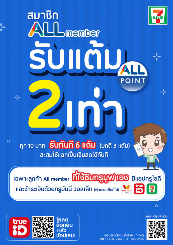 ทุกช่องทาง พร้อมชำระเงินผ่านทรูมันนี่ วอลเล็ท ซึ่งการใช้จ่ายทุก 10 บาท รับเลย ALL POINT 6 แต้ม จากปกติ 3 แต้ม เพื่อเก็บสะสมไว้ใช้เป็นส่วนลดแทนเงินสด โดยลูกค้าทรูมูฟ เอช เพียงลงทะเบียนใช้งานแอปทรูมันนี่ วอลเล็ท แอปทรูไอดีและเซเว่นแอปเป็นเบอร์เดียวกัน พร้อมล็อกอินเข้าใช้งานแอปทรูไอดีอย่างน้อย 1 ครั้ง ภายในระยะเวลา 90 วันเท่านั้น…อย่าช้า รีบช้อป เก็บแต้มแบบดับเบิ้ลได้แล้ว ตั้งแต่วันนี้ ถึง 31 ธันวาคม 2564