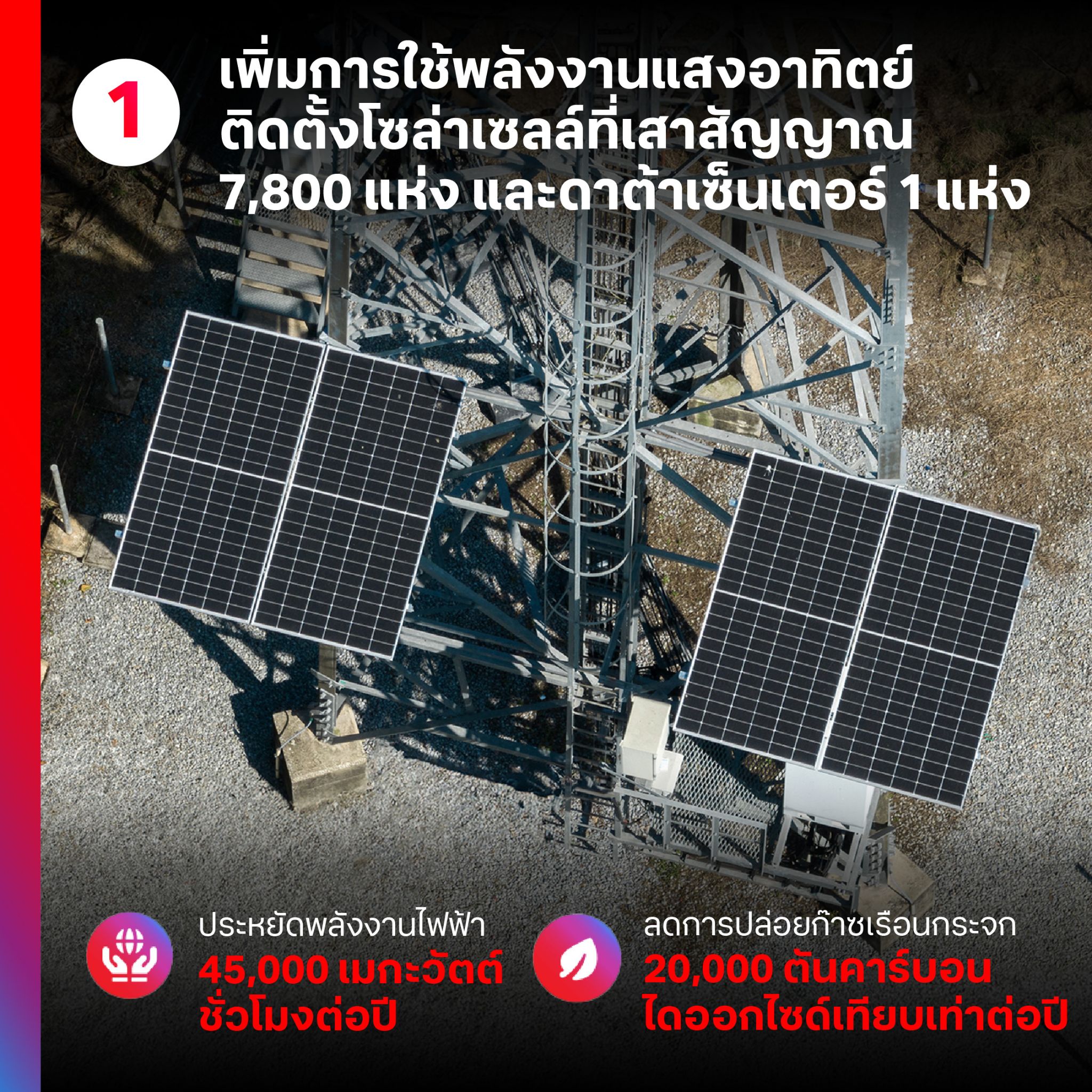 - เพิ่มการใช้พลังงานแสงอาทิตย์ ติดตั้งโซล่าเซลล์ที่เสาสัญญาณ 7,800 แห่ง และดาต้าเซ็นเตอร์ 1 แห่ง