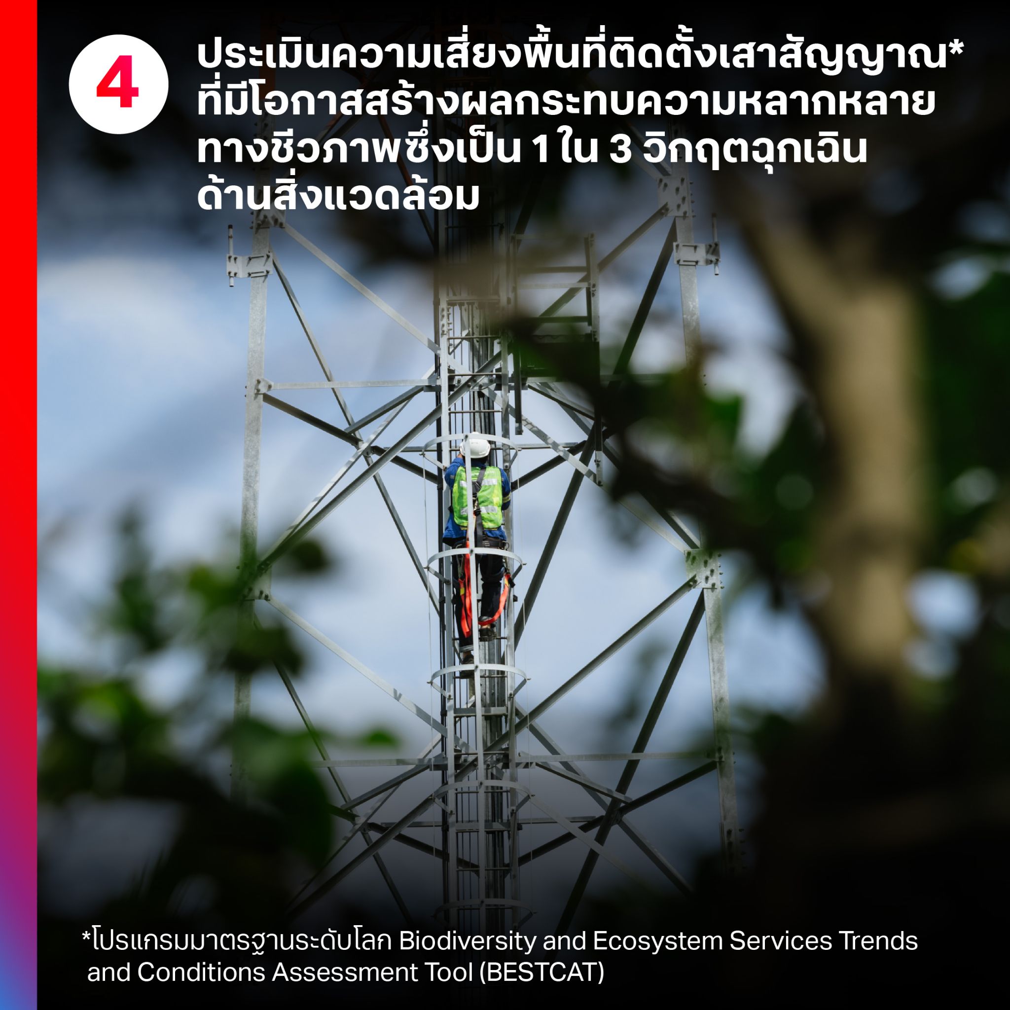 - ประเมินความเสี่ยงพื้นที่ติดตั้งเสาสัญญาณ* ที่มีโอกาสสร้างผลกระทบความหลากหลายทางชีวภาพซึ่งเป็น 1 ใน 3 วิกฤตฉุกเฉินด้านสิ่งแวดล้อม