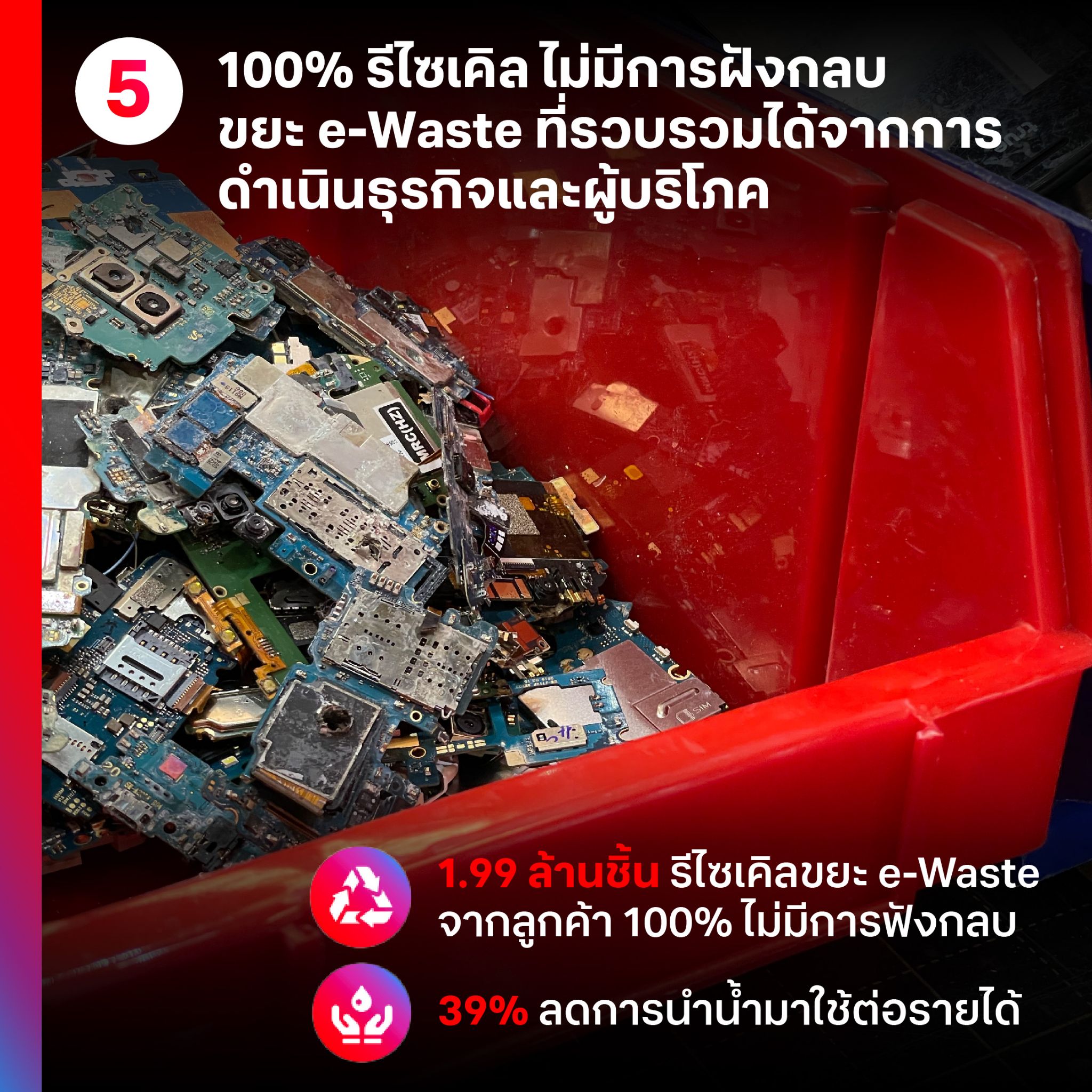 - 100% รีไซเคิล ไม่มีการฝังกลบขยะ e-Waste ที่รวบรวมได้จากการดำเนินธุรกิจและผู้บริโภค