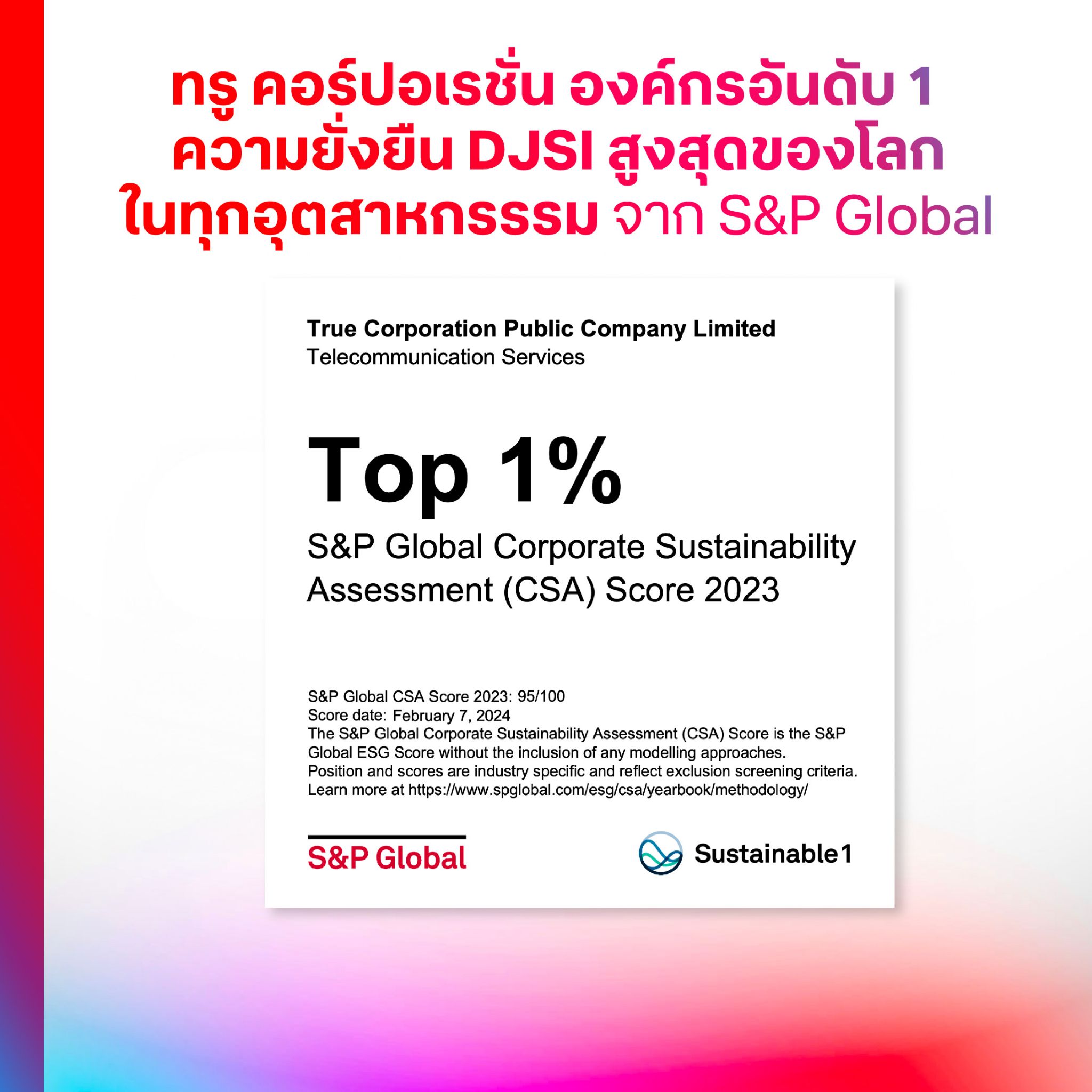 ทั้งนี้ ทรู คอร์ปอเรชั่น องค์กรอันดับ 1 ความยั่งยืน DJSI สูงสุดของโลกในทุกอุตสาหกรรมจาก S&P Global