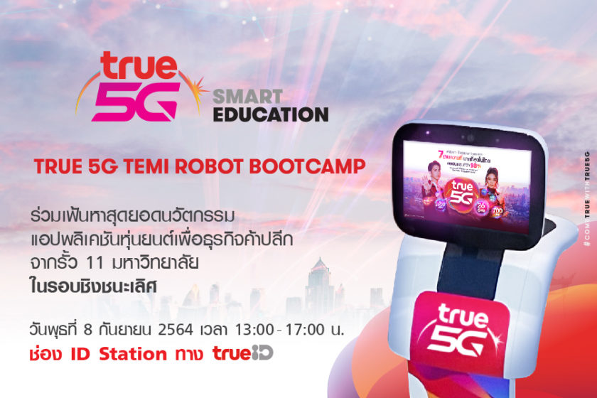 ทรู 5G ชวนเหล่านิสิตนักศึกษาและผู้สนใจร่วมชมและเชียร์ 11 ทีมสุดท้ายจากรั้วมหาวิทยาลัย ประชันผลงานแอปพลิเคชันหุ่นยนต์เพื่อธุรกิจค้าปลีกในรอบชิงชนะเลิศ เฟ้นหาสุดยอดนวัตกรรมในโครงการ True5G Temi Robot Bootcamp ที่เปิดโอกาสให้นิสิตนักศึกษาใช้หุ่นยนต์อัจฉริยะ True5G Temi Connect & Carebot ผ่านเครือข่ายอัจฉริยะทรู 5G พัฒนานวัตกรรมที่ใช้งานได้จริงในอุตสาหกรรมค้าปลีก โดยทีมที่ได้รับรางวัลชนะเลิศ รองชนะเลิศอันดับหนึ่ง และรองชนะเลิศอันดับสอง จะได้รับเงินสนับสนุนการพัฒนานวัตกรรม 200,000 บาท, 100,000 บาท และ 50,000 บาท ตามลำดับ พร้อมประกาศนียบัตร ร่วมชมความสามารถของนิสิตนักศึกษาไทยและลุ้นการประกาศผลการแข่งขันพร้อมกันในวันพุธที่ 8 กันยายน 2564 เวลา 13.00-17.00 น. ที่ช่องไอดี สเตชั่น ทางทรูไอดี หรือรับชมได้ที่ https://trueid.onelink.me/14Ip/6532035a