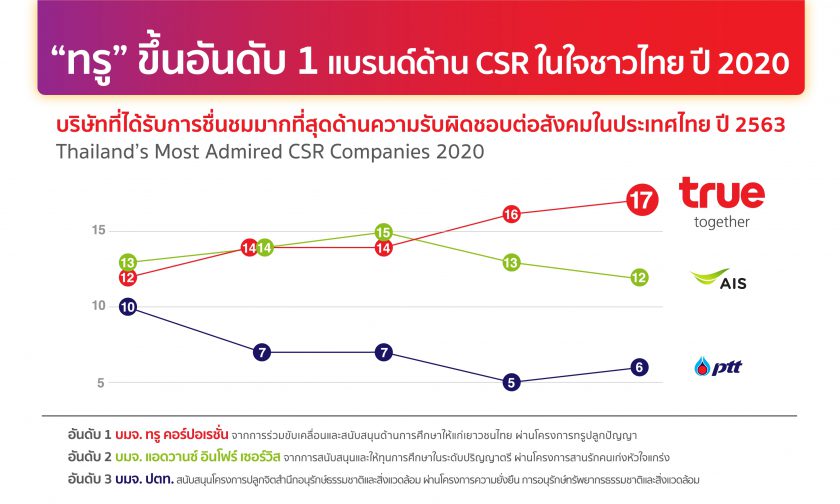 นั่นจึงเป็นที่มาว่าทำไมคนไทยส่วนใหญ่ถึงนึกชื่อ “ทรู” เป็นคำตอบแรก เมื่อถูกถามถึงบริษัทที่คุณรู้สึกชื่นชมมากที่สุดด้านความรับผิดชอบต่อสังคมในไทย จากการสำรวจของบริษัทวิจัยด้านการตลาดชั้นนำ ไทพ์วันแล็บ ร่วมกับ มาร์เก็ตบัซซ วันนี้เรามาดูกันว่า 5 หัวใจแห่งการทำภารกิจเพื่อสังคม ซึ่งเป็นกุญแจสำคัญที่ทำให้ทรู สามารถก้าวเป็นแบรนด์ที่ 1 ด้าน CSR ในใจชาวไทย คืออะไรบ้าง…