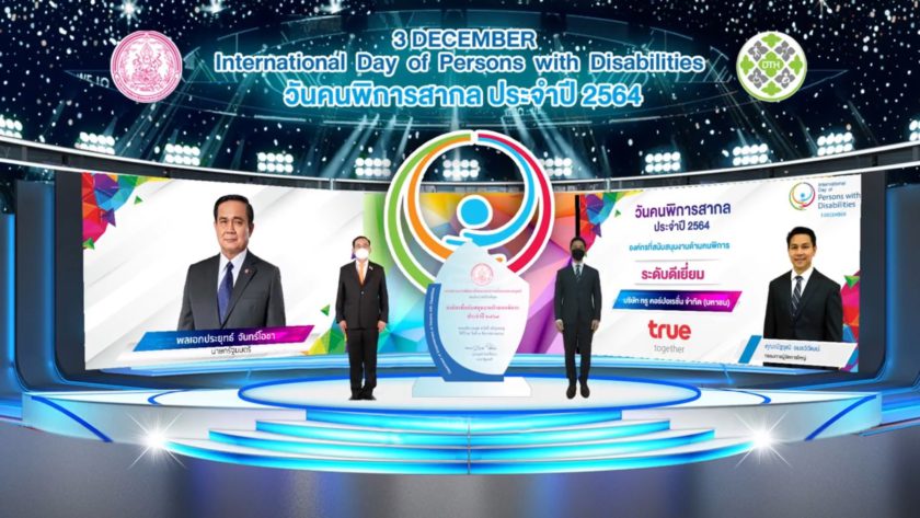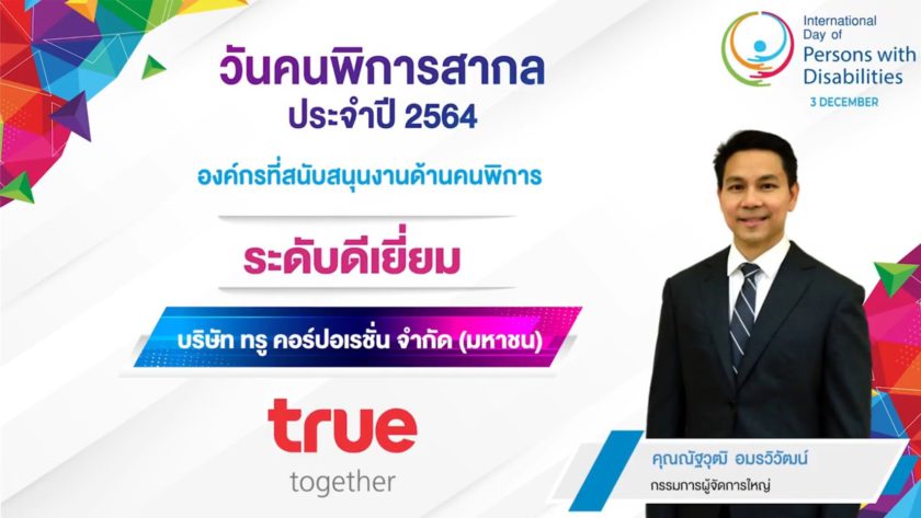 กรุงเทพฯ 3 ธันวาคม 2564 – พลเอก ประยุทธ์ จันทร์โอชา นายกรัฐมนตรี เป็นประธานเปิดงานวันคนพิการสากล ประจำปี 2564 พร้อมมอบรางวัลโล่ประกาศเกียรติคุณองค์กรที่สนับสนุนงานด้านคนพิการดีเยี่ยม แก่กลุ่มทรู โดย คุณณัฐวุฒิ อมรวิวัฒน์ กรรมการผู้จัดการใหญ่ (ร่วม) ซึ่งถือเป็นรางวัลระดับสูงสุดในงาน ที่กลุ่มทรูได้รับต่อเนื่องเป็นปีที่ 5 ตอกย้ำความเป็นองค์กรที่รับผิดชอบต่อสังคม สนับสนุนกลุ่มผู้เปราะบางทุกมิติอย่างจริงจังและต่อเนื่อง ทั้งการนำนวัตกรรมเทคโนโลยีสื่อสารดิจิทัล มาสร้างสรรค์สินค้าและบริการ เพื่อช่วยพัฒนาศักยภาพ และทักษะความรู้แก่กลุ่มคนเปราะบาง ให้สามารถสร้างอาชีพ มีรายได้ และพึ่งพาตนเองได้ ตรงตามเป้าหมายด้านการพัฒนาอย่างยั่งยืนภายใต้ยุทธศาสตร์ในกรอบ 3 H’s ของกลุ่มทรู อันประกอบด้วย Heart – มุ่งมั่นทำธุรกิจด้วยใจที่ยั่งยืน Health – มุ่งมั่นสร้างสังคมที่ยั่งยืน และ Home – มุ่งมั่นเพื่อสิ่งแวดล้อมที่ยั่งยืน