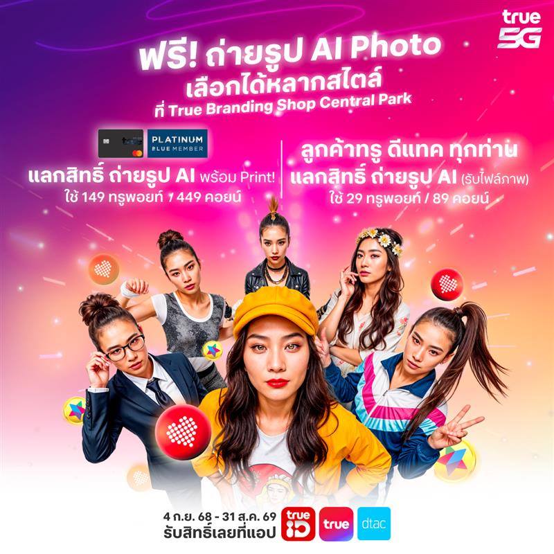 พิเศษ เพื่อเป็นการเฉลิมฉลองการเปิดตัวอย่างเป็นทางการของ “True Branding Shop” และ “TrueSphere” ณ Dusit Central Park ทรูพร้อมมอบสิทธิพิเศษที่คัดสรรมาให้กับลูกค้าใด้สัมผัสความสร้างสรรค์ในแบบคุณกับ “Generative AI Snap Photo” ถ่ายภาพครีเอทีฟ 4 แอ็กชัน สำหรับลูกค้าทรูและดีแทค แลกเพียง 29 ทรูพอยท์ หรือ 89 ดีแทคคอยน์ รวมถึงเป็นเจ้าของ Pocketalk S Plus อุปกรณ์ล่ามอัจฉริยะดีไซน์พรีเมียม ในราคาพิเศษเพียง 9,500 บาท (จากปกติ 9,900 บาท) ตั้งแต่วันนี้ – 30 กันยายน 2568