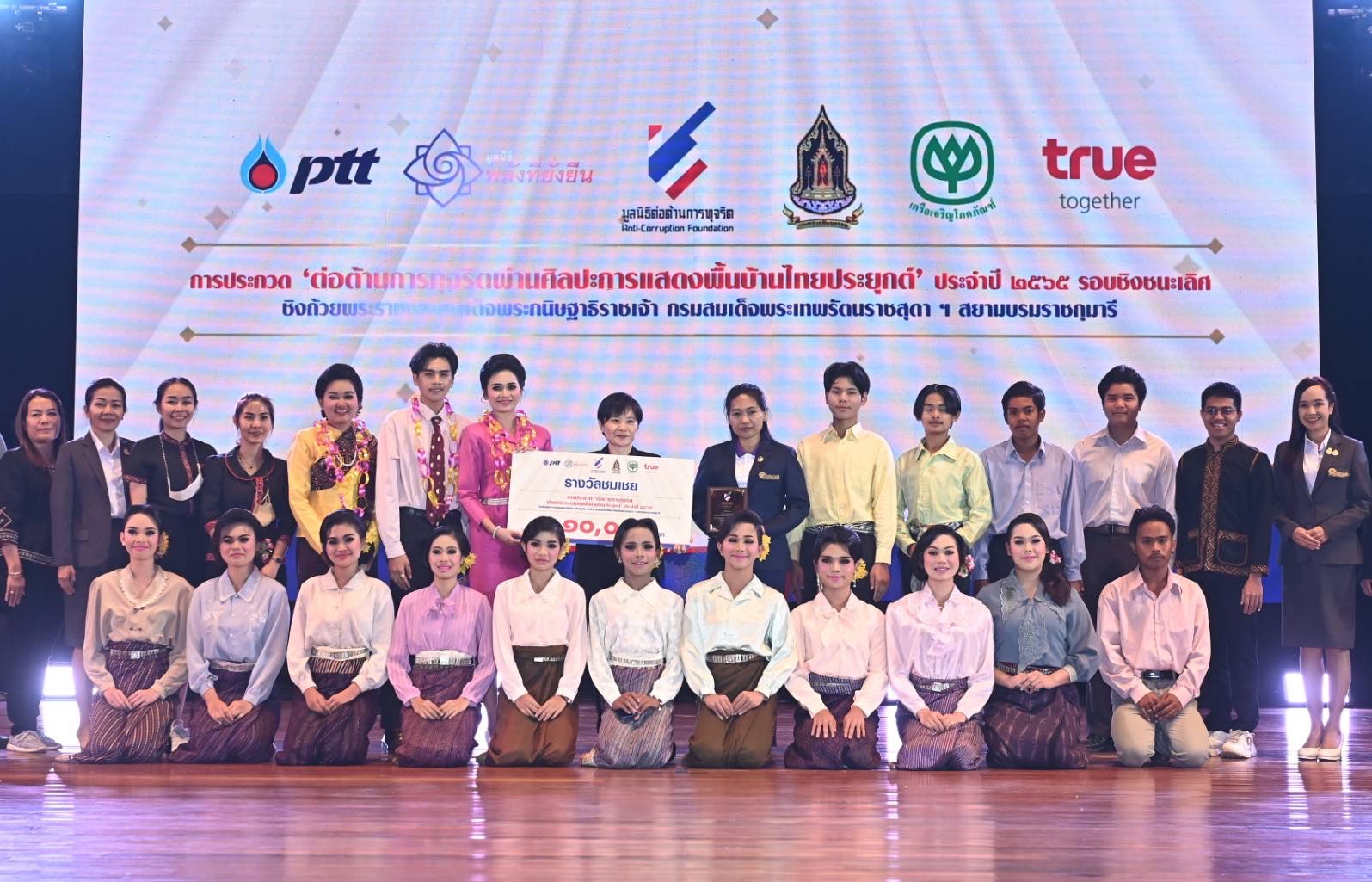 มูลนิธิต่อต้านการทุจริต, กระทรวงวัฒนธรรม, เครือเจริญโภคภัณฑ์ และกลุ่มทรู จัดการประกวด‘ต่อต้านการทุจริตผ่านศิลปะการแสดงพื้นบ้านไทยประยุกต์’ ประจำปี 2565 รอบชิงชนะเลิศ ถ้วยพระราชทานสมเด็จพระกนิษฐาธิราชเจ้า กรมสมเด็จพระเทพรัตนราชสุดา ฯ สยามบรมราชกุมารี พร้อมทุนการศึกษา มูลค่ากว่า 685,000 บาท ณ หอประชุมใหญ่ ศูนย์วัฒนธรรมแห่งประเทศไทย