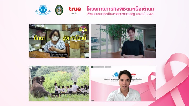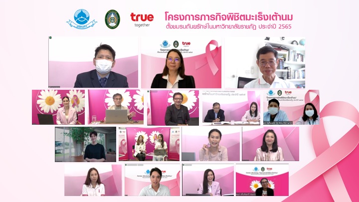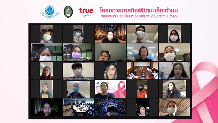 เมื่อวันที่ 8 สิงหาคม 2565 : มูลนิธิถันยรักษ์ ในพระราชูปถัมภ์สมเด็จพระศรีนครินทราบรมราชชนนี ร่วมกับมหาวิทยาลัยราชภัฏ และกลุ่มทรู โดยฝ่ายกิจกรรมองค์กรเพื่อสังคม ทรูปลูกปัญญา สานพลังสร้างแนวร่วมลดภัยมะเร็งเต้านม จัดอบรมเชิงปฏิบัติการในรูปแบบออนไลน์ (Online Workshop) ‘โครงการภารกิจพิชิตมะเร็งเต้านม จัดตั้งชมรมถันยรักษ์ในมหาวิทยาลัยราชภัฏ’ ประจำปี 2565 ให้แก่นักศึกษา และอาจารย์ที่ปรึกษา จำนวน 329 คน จากมหาวิทยาลัยราชภัฏที่เข้าร่วมภารกิจทั้ง 26 แห่งทั่วประเทศ โดยการจัดตั้งชมรมในครั้งนี้ เป็นกิจกรรมที่ขยายผลสืบเนื่องมาจากการตอบรับที่ดีของการอบรมให้ความรู้ แก่ตัวแทนคณะทำงานจากมหาวิทยาลัยราชภัฏทั่วประเทศที่ผ่านมา มีวัตถุประสงค์ในการรณรงค์ให้ผู้หญิงไทยหมั่นตรวจเต้านมด้วยตัวเองอย่างถูกต้อง และสม่ำเสมอ เพื่อลดการสูญเสียชีวิตจากโรคมะเร็งเต้านม โดยได้รับเกียรติจาก คุณบุษดี เจียรวนนท์ เลขาธิการมูลนิธิถันยรักษ์ ในพระราชูปถัมภ์สมเด็จพระศรีนครินทราบรมราชชนนี กล่าวเปิดงาน