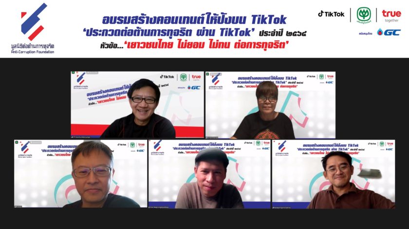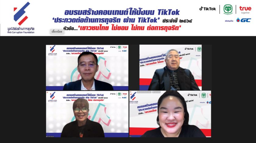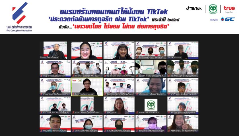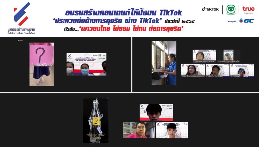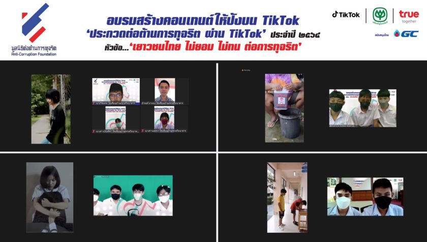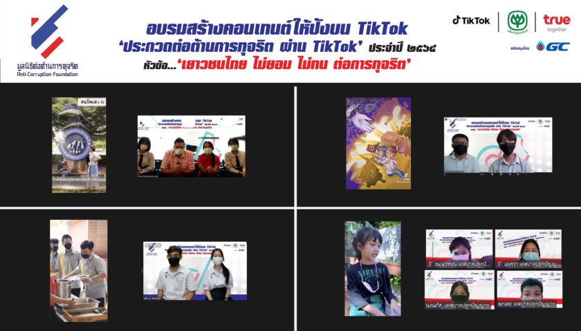 7 กุมภาพันธ์ 2565 – มูลนิธิต่อต้านการทุจริต ร่วมกับ เครือเจริญโภคภัณฑ์ กลุ่มทรู และ TikTok นำ 11 ทีม ที่ผ่านเข้ารอบชิงชนะเลิศ อบรมสร้างคอนเทนต์ให้ปังบน TikTok ในโครงการการประกวด ‘ต่อต้านการทุจริต ผ่านTikTok’ ประจำปี 2564 หัวข้อ ‘เยาวชนไทย ไม่ยอม ไม่ทน ต่อการทุจริต’ ผ่านทางออนไลน์